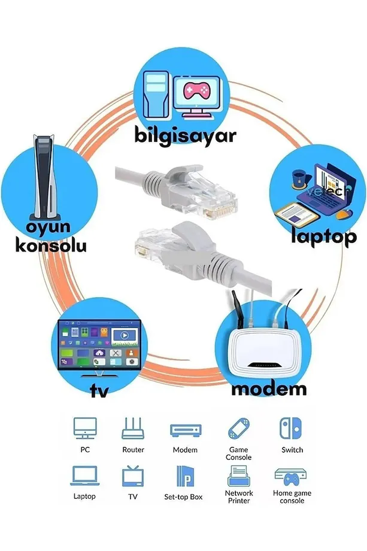 Her iki ucunda RJ45 konnektörleri bulunan kablo, bilgisayarları, dizüstü bilgisayarları, sunucuları bir yönlendiriciye veya kablolu Yerel Alan Ağı'na (LAN) evrensel olarak bağlayacaktır. Herhangi bir elektronik cihaz, bir RJ45 portu olduğu sürece bu kabloyu kullanabilir. Buna Xbox, PS4, HDTV, switch, yazıcı dahildir.