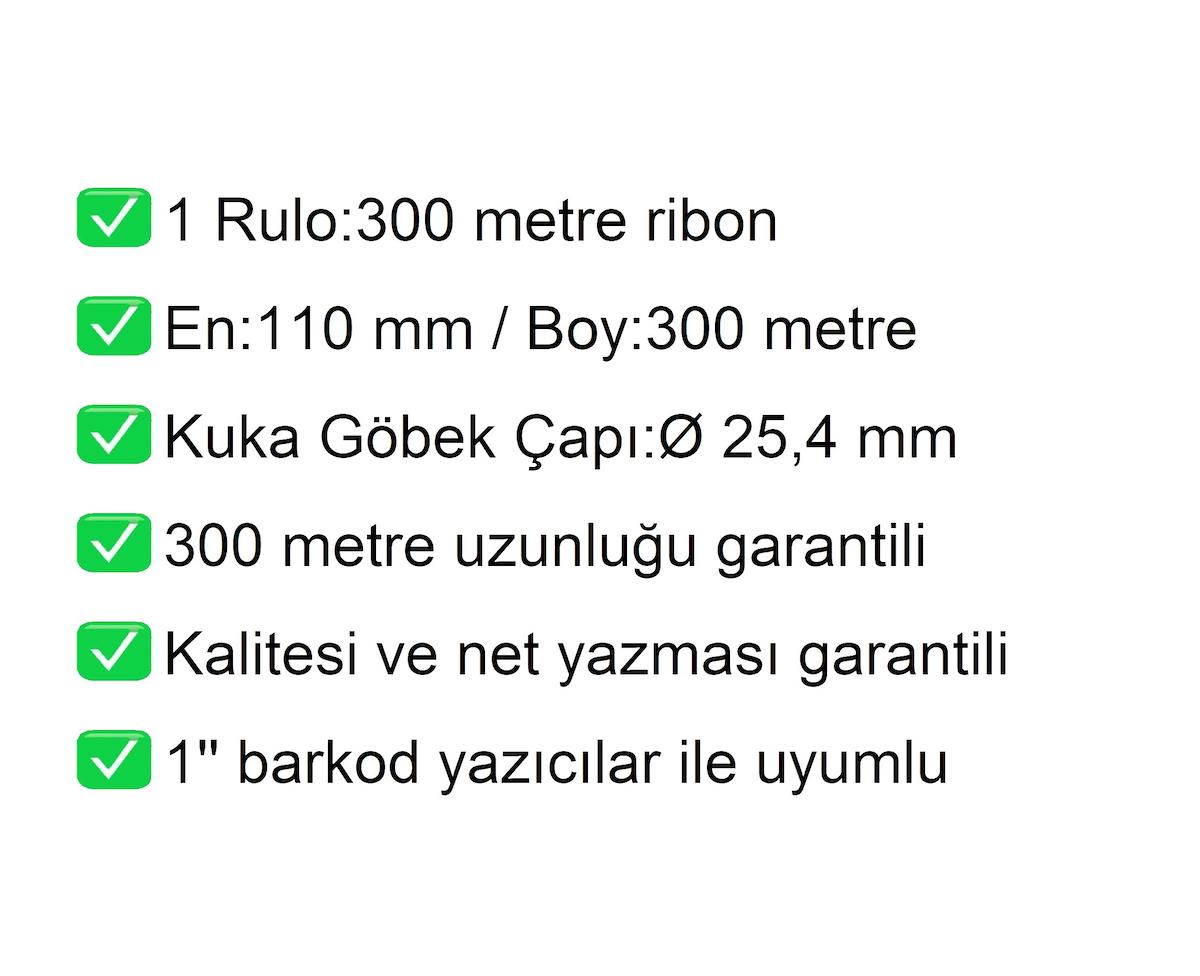 110x300 Metre Wax Ribonun özellikleri ve açıklamaları aşağıda verilmiştir. Farklı ölçü seçenekleri ve daha fazla bilgi için mağazamızı ziyaret edebilirsiniz.