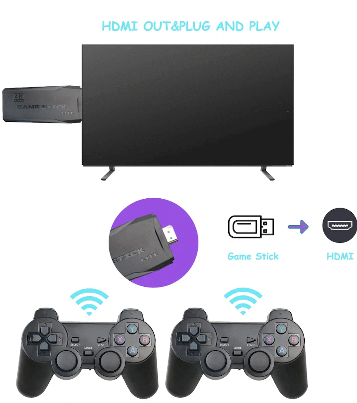 2 adet 2.4Ghz kablosuz oyun denetleyicileri ile donatılmış, kontrolörün bağlantı mesafesi 8-10 metredir. Aynı anda 4 oyuncuya kadar destek, aile veya arkadaşlarınızla çok oyunculu oyunların tadını çıkarabilirsiniz.