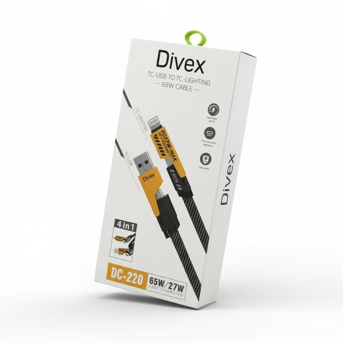 Divex 4-in-1 Kablo ile teknolojik ihtiyaçlarınızı tek bir şık ve güçlü çözümle karşılayın. Hayatınızı basitleştirin, hızlandırın ve kablo karmaşasına son verin!