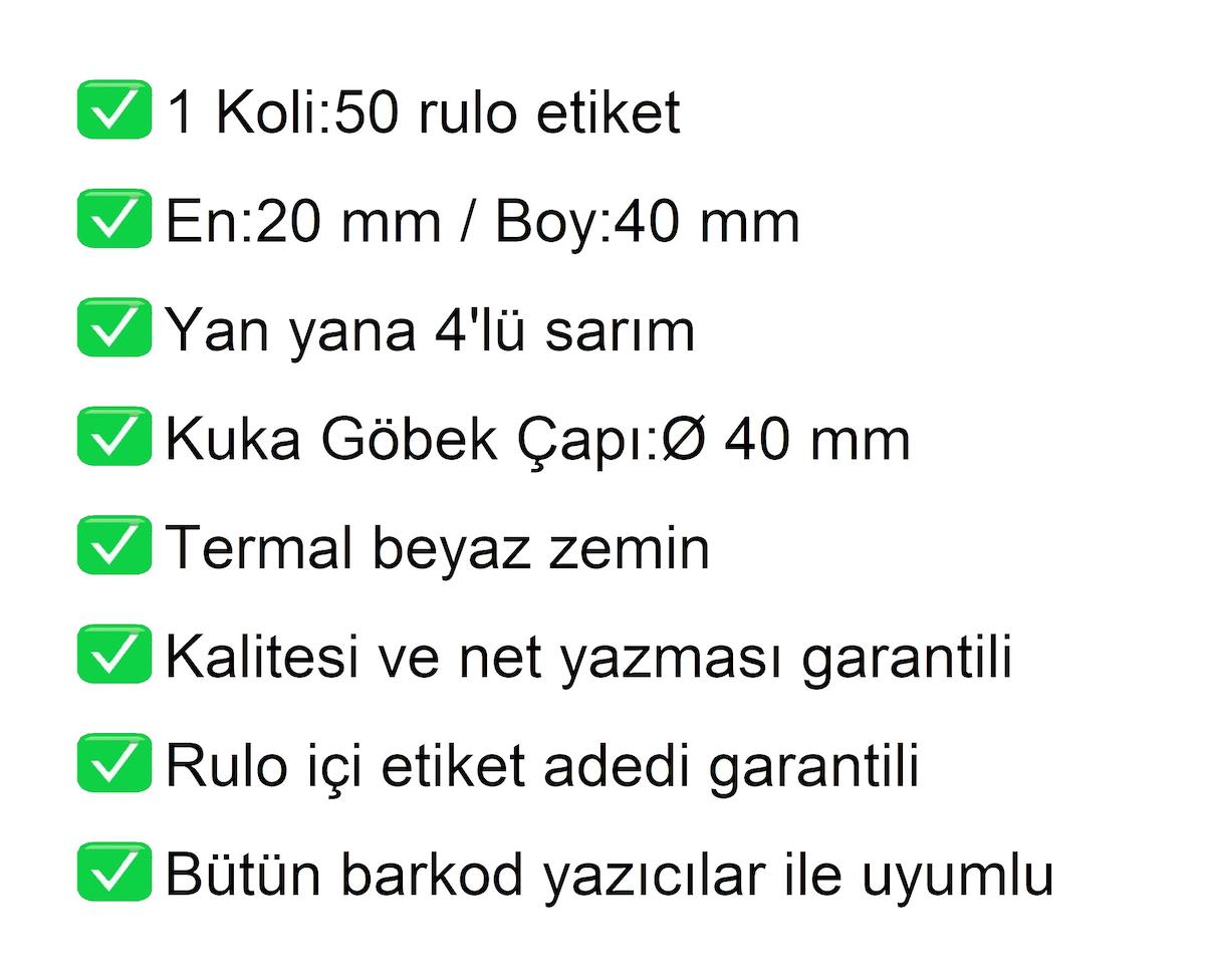 40x20 mm Termal ürün Barkod Etiketinin özellikleri ve açıklamaları aşağıda verilmiştir. Farklı ölçü seçenekleri ve daha fazla bilgi için mağazamızı ziyaret edebilirsiniz.