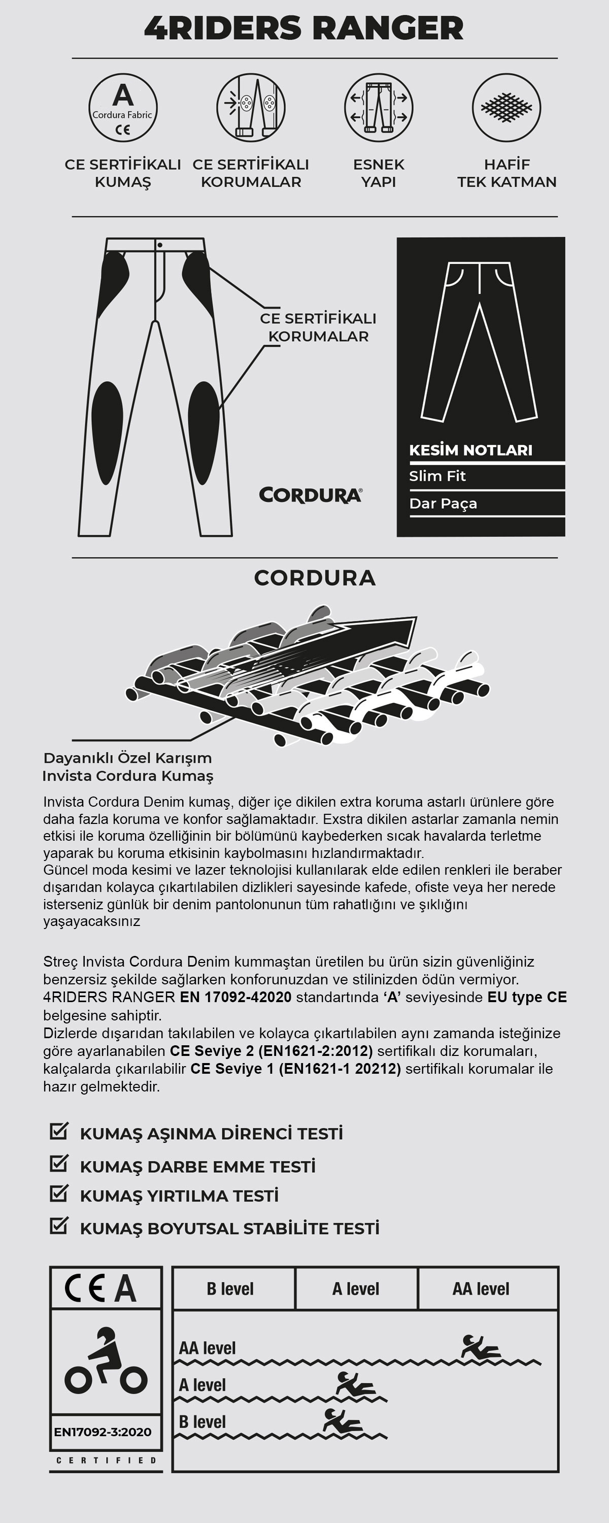 4Riders Ranger CE Sertifikalı Cordura Denim Korumalı Motosiklet Kot Pantolonu Antrasit