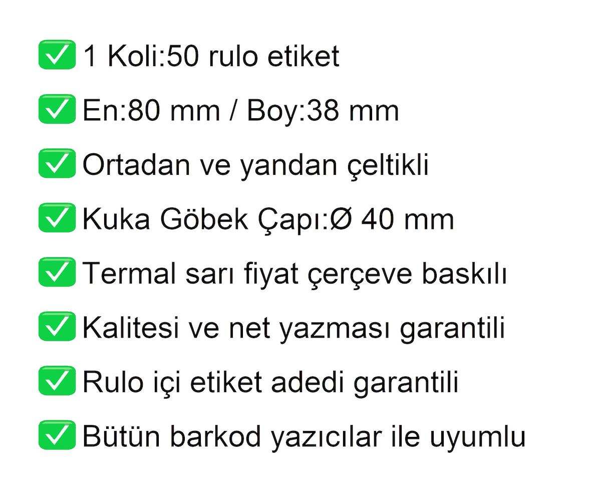 80x38 mm Sarı Çerçeveli Karton Termal Raf Etiketinin özellikleri ve açıklamaları aşağıda verilmiştir. Farklı ölçü seçenekleri ve daha fazla bilgi için mağazamızı ziyaret edebilirsiniz.