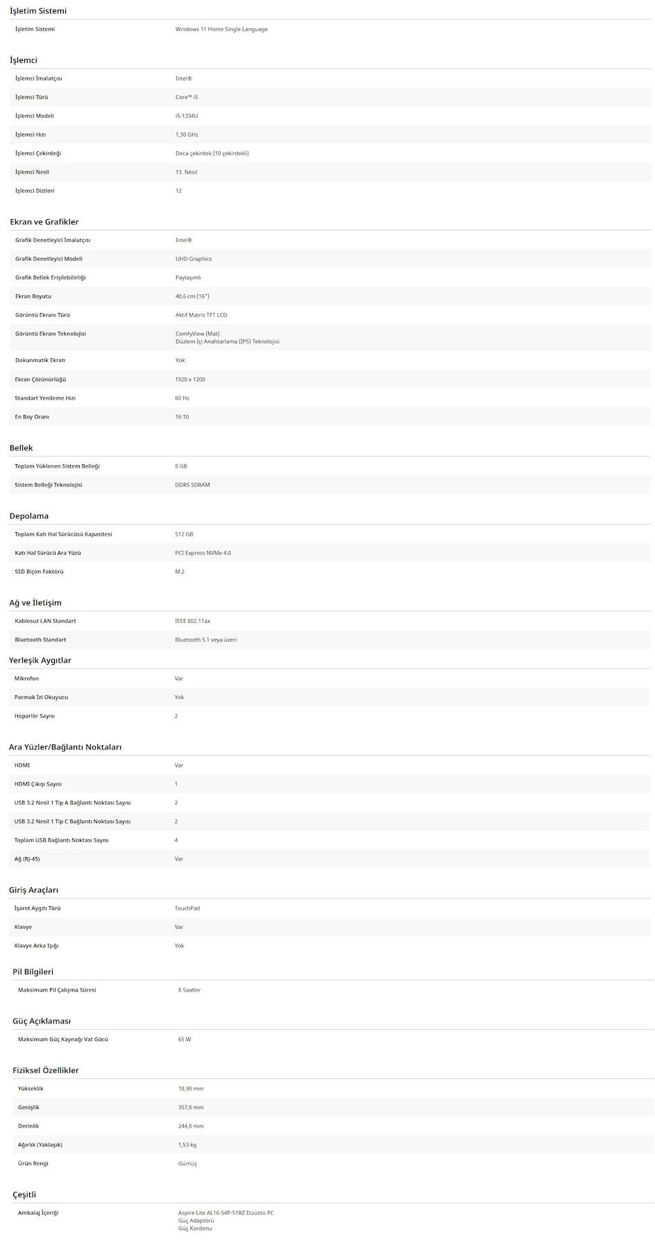 Acer Aspire Lite AL16-54P-51RZ i5-1334U 8GB DDR5 512GB SSD 16" FHD Windows11 Home