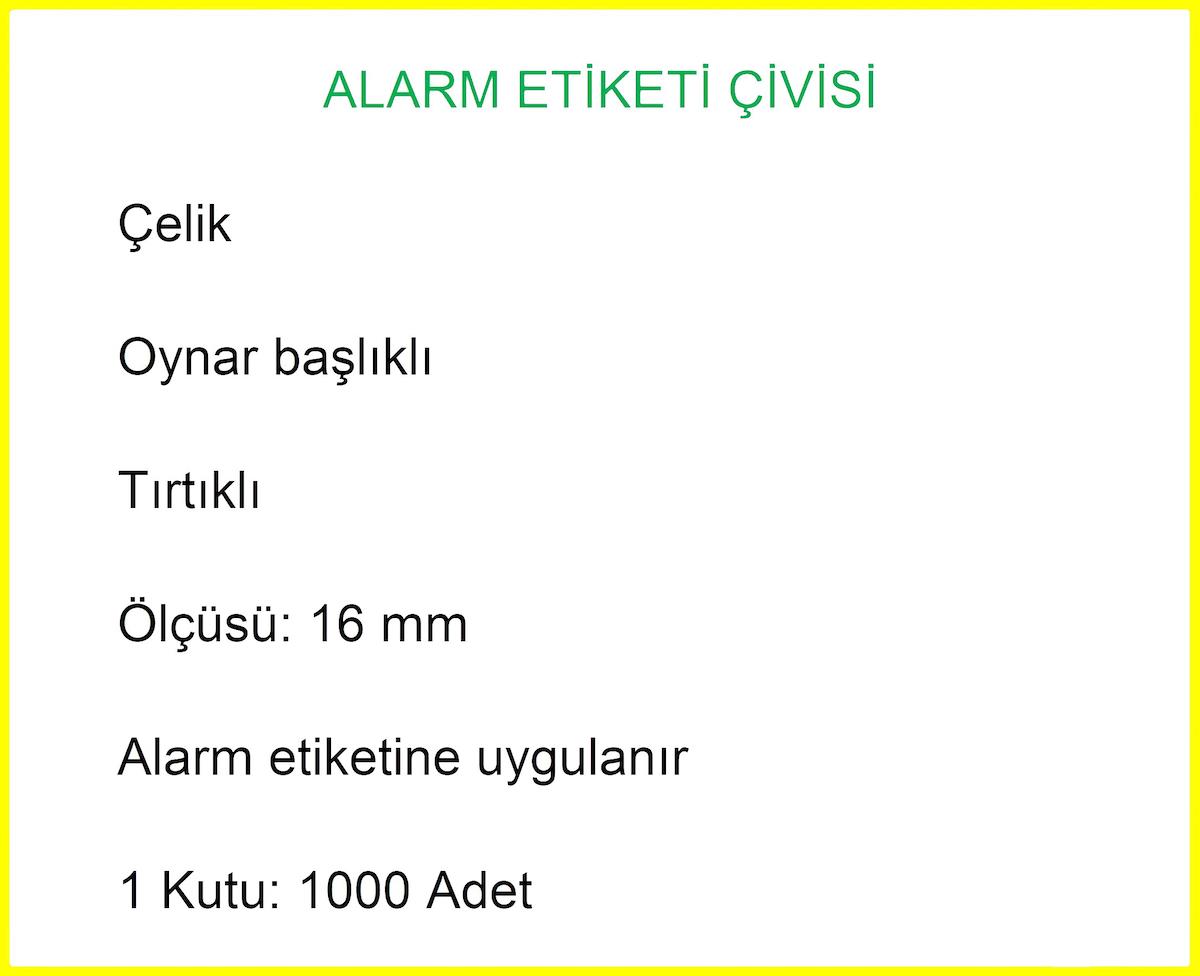 Secadoor düz başlı, tırtıklı alarm çivisi; sağlam ve dayanıklı çelikten üretilmiştir. Düz oynar başlı olup, çivi kısmı tırtıklıdır. 16 mm boyunda olan bu alarm çivisi, tüm Secadoor sert plastik alarm etiketleri ile kullanılabilir.