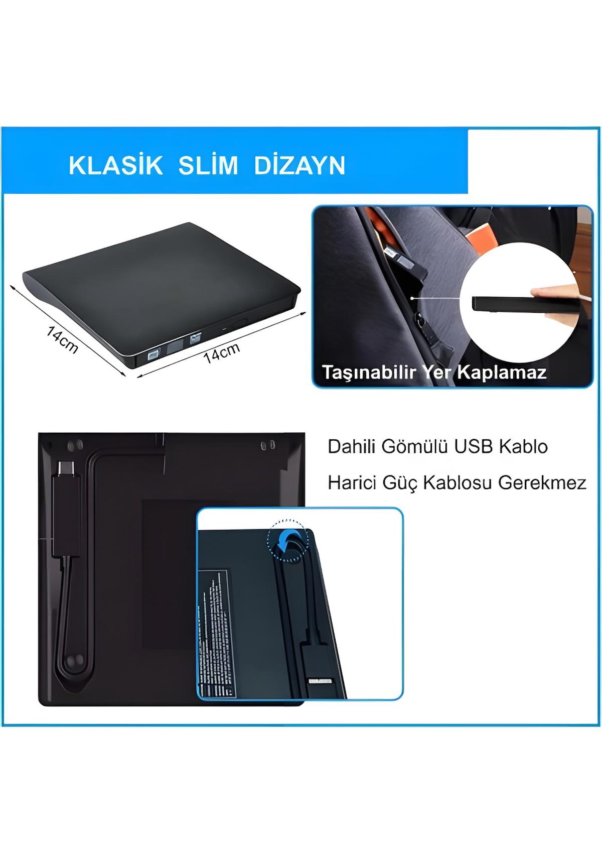 KOMPAKT VE TAŞINABİLİR: İnce tasarım ve hafif kompakt tasarım, bu CD DVD okuyucuyu yazıcıyı evde, ofiste veya seyahatte, istediğiniz zaman, istediğiniz yerde kullanmanıza olanak tanır. Entegre USB konektörü kullanımı ve saklanmasını kolaylaştırır.