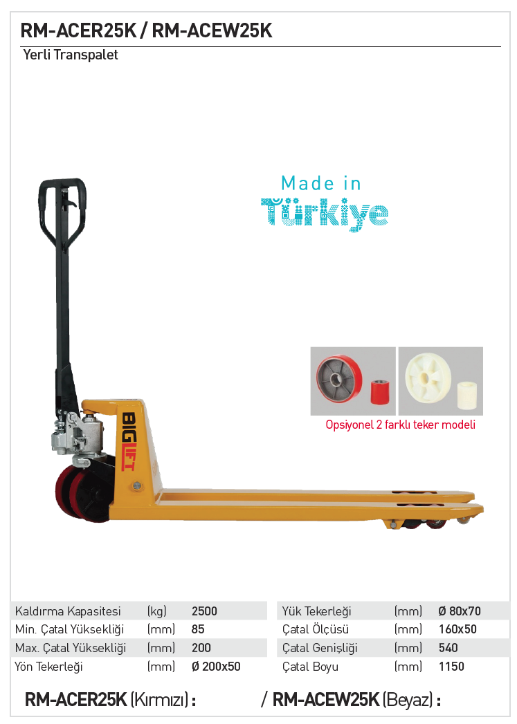 Biglift ACER25K 2,5 Ton Kırmızı Tekerlekli Transpalet