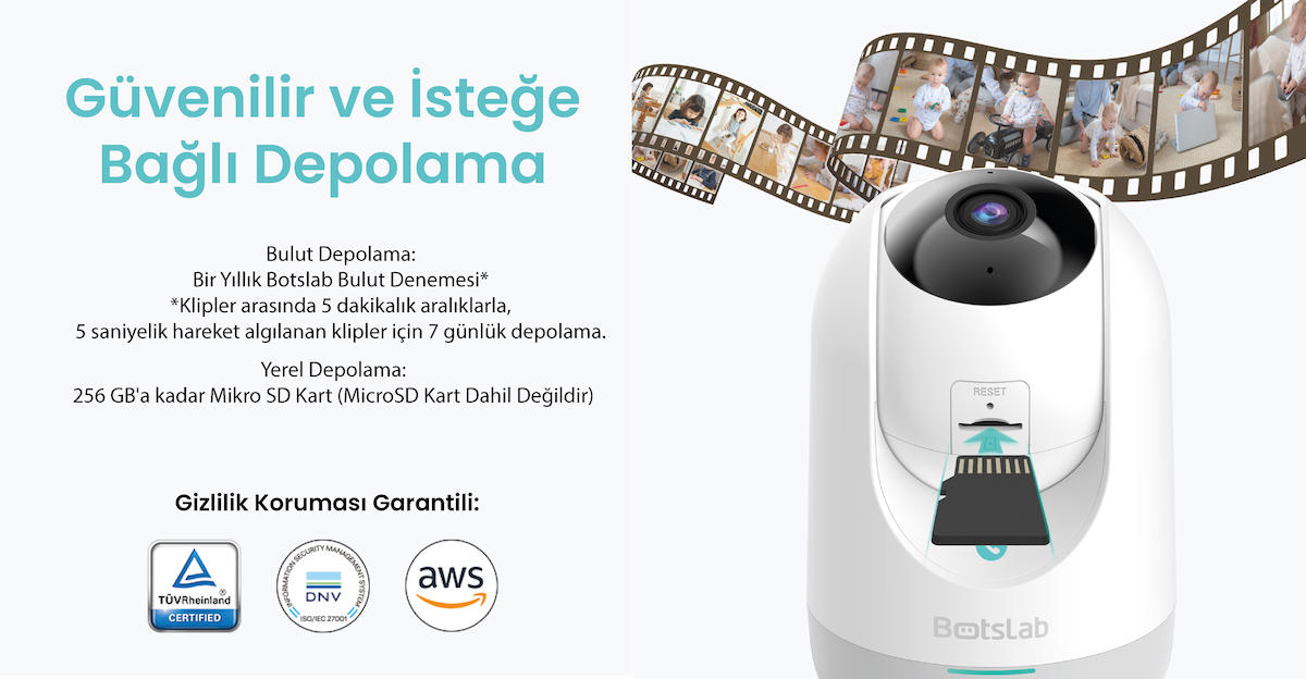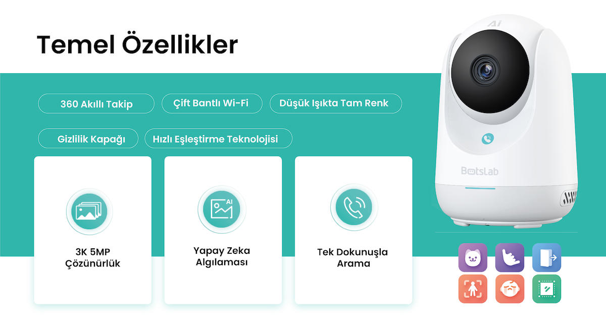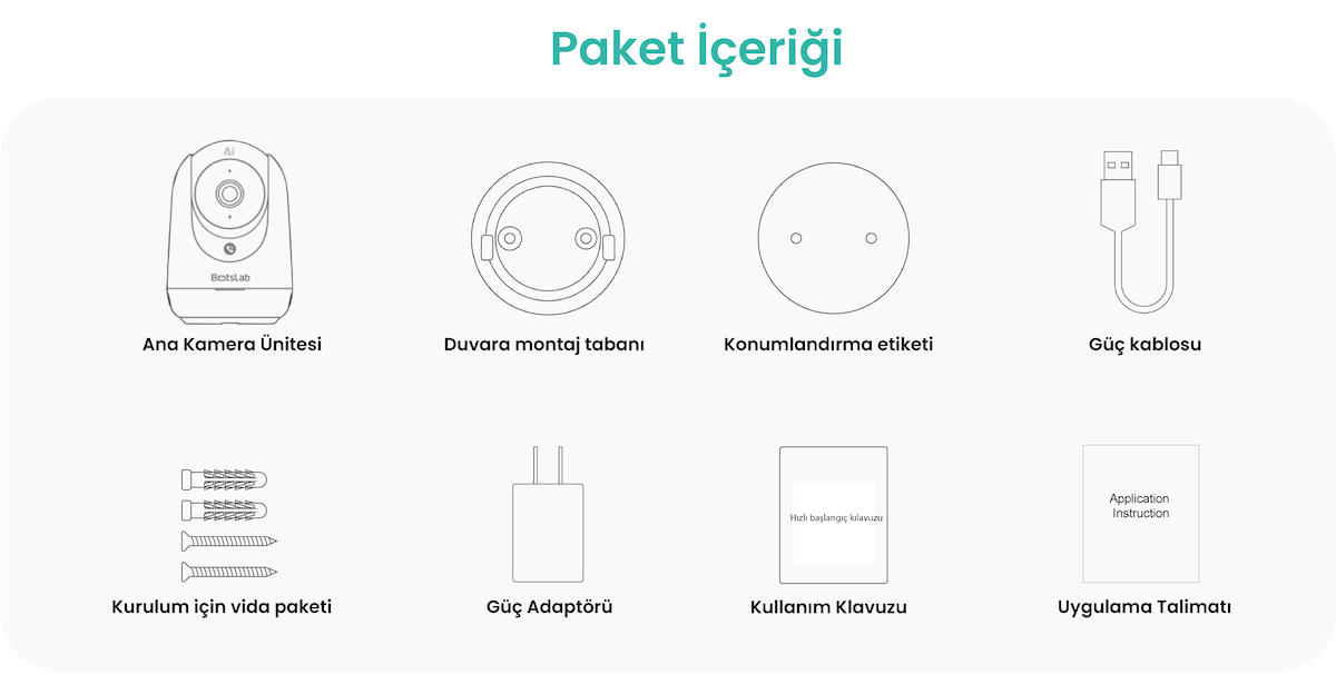 • Paket İçeriği: Ana kamera ünitesi, Duvara sabitlenebilir tavan, Konumlandırma etiketi, kablo, Montaj için vida paketi, Şarj aleti, pratik başlangıç kılavuzu, Kullanım Kılavuzu