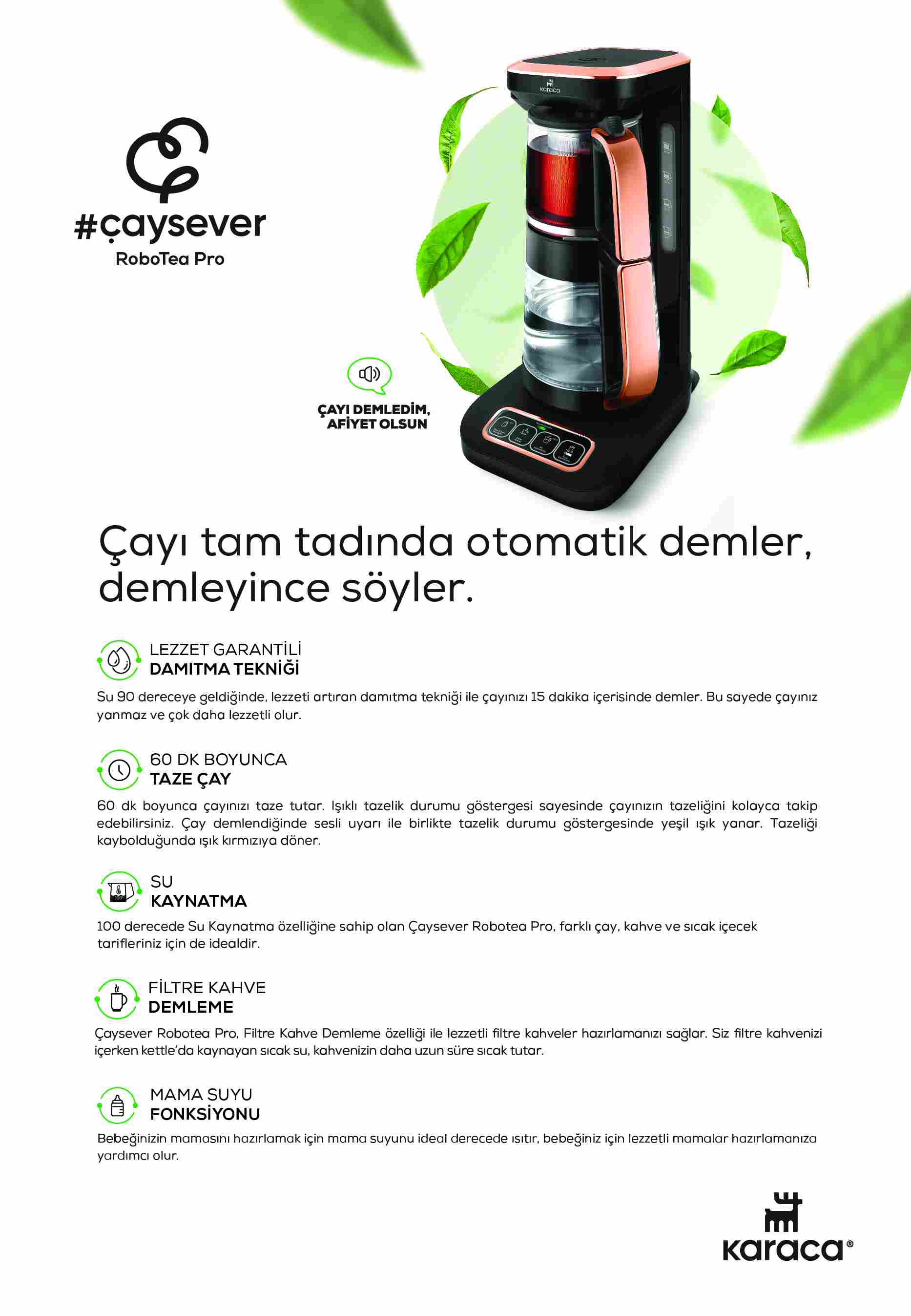 Çayınızı, lezzet garantili damıtma tekniğini kullanarak 15 dakikada demleyen Çaysever Robotea Pro, çay yapraklarını yakmadan lezzeti tam tadında, çayın demlenmesini sağlar. 90 derecede ideal renge ve lezzete kavuşan çayınız 60 dakika boyunca taze kalır. Üstelik çayınızın tazeliğini de tazelik durumunu gösteren ışık göstergesiyle takip edebilirsiniz. Farklı ısıtma derecelerine sahip olan Çaysever Robotea Pro ile 40 derecede bebeğiniz için ideal mamalar hazırlayabilir, 100 derecede su kaynatarak lezzetli bitki çayları ve sıcak içecekler yapabilirsiniz. Ayrıca filtre kahve demleyebileceğiniz Çaysever Robotea Pro ile 40 dakika boyunca taze kahvelerin keyfini çıkarabilirsiniz. Tüm bunların yanında, çayınız veya kahveniz demlenirken tüm süreç boyunca konuşarak bilgilendirir. 0,8 litre kapasiteli cam demliği ve 1,5 litre kapasiteli cam su haznesi sayesinde aileniz ve misafirlerinizle çayın keyfine varabilirsiniz