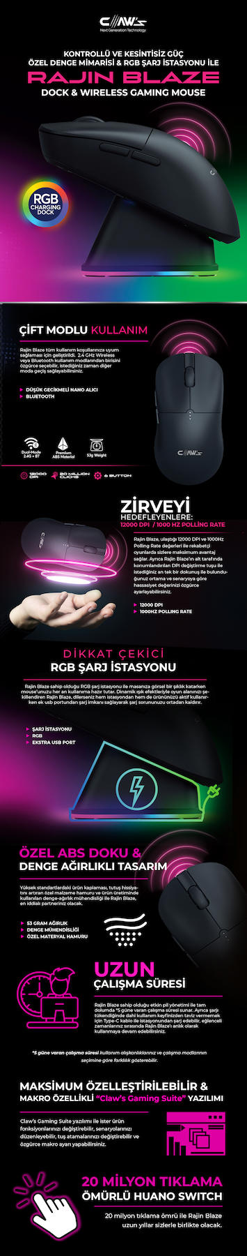 Rajin Blaze 12000 Dpi RGB Standlı Kablosuz Gaming Mouse - Siyah (2.4 GHz + Bluetooth)- Yüksek performanslı oyun deneyimi için 12000 DPI ayarlanabilir hassasiyet sunar.; - Kablosuz bağlantı özelliği sayesinde hareket özgürlüğü sağlar ve kablo karmaşasına son verir.; - RGB aydınlatma ile kişiselleştirilebilir tasarım, oyun kurulumunuza estetik bir dokunuş katar.; - Optik sensör teknolojisi, hassas ve hızlı takip imkanı sunarak oyunlardaki tepki sürenizi .; - Şarjlı batarya tipi ile kesintisiz oyun keyfi yaşatır; uzun süreli kullanımlarda bile enerjisini korur.; - 6 adet programlanabilir buton, oyun içi komutlarınızı kolayca atamanız için esneklik sağlar.; - Tek ebat tasarımıyla farklı el boyutlarına uyum sağlar ve rahat bir kullanım sunar.; - İthalatçı garantili olması, ürününüzün 2 yıl boyunca güvenle kullanabileceğinizin bir göstergesidir.; - CN menşeli olup, CLAWS TEKNOLOJI YATIRIMLARI ITHALAT VE IHRACAT LIMITED SIRKETI tarafından üretilmiştir.