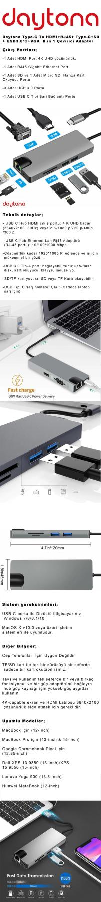 Daytona FC09 Macbook Uyumlu Type-C To 4K 1080P Hd HDMI 1000 Mbps Gigabit Ethernet RJ45 Pd Sd Kart 2* USB 3.0 VGA 8ın1 Çevirici Hub Adaptör