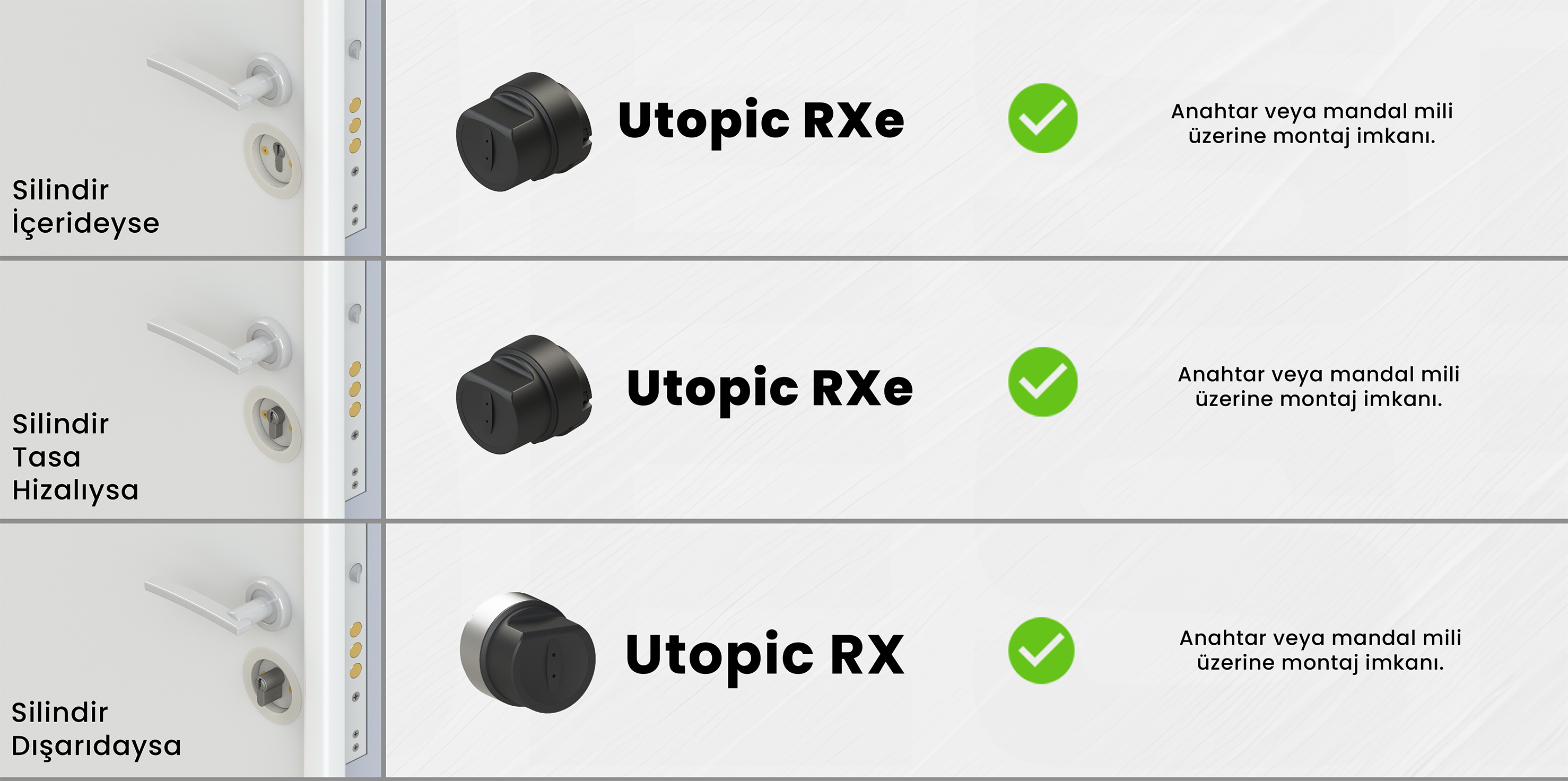 Mevcut silindirinizi değiştirmeden veya anahtarı kesmeden rozet ve taslı kapılara monte edebilirsiniz. (Türkiye'de üretilen çelik kapıların neredeyse tamamında rozet/tas bulunur) Panik silindir (iç tarafta silindir üzerinde anahtar olsa dahi dışarıdan da açılabilen özellikli barel tipi) ihtiyacı olmadanakıllı kilidin patentli özelliği sayesinde dışarıdan daanahtarınız ile giriş yapabilirsiniz.(Patentli özellik ve sadece Utopic RX serisinde)