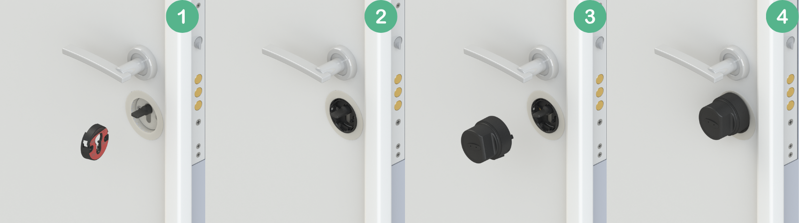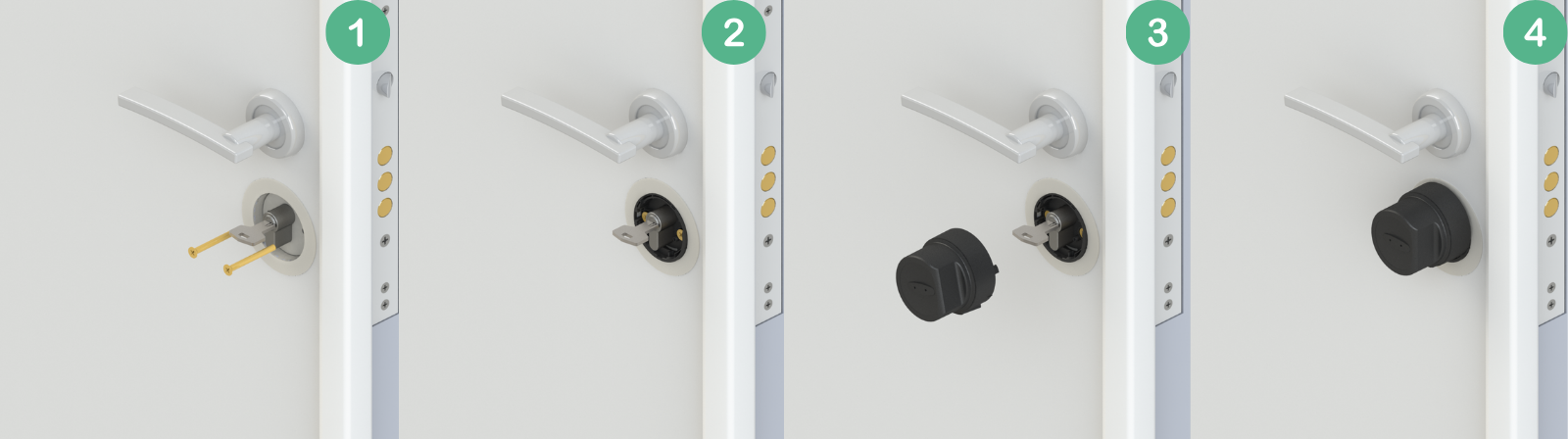 1. Mevcut rozet vidalarını çıkarın 2. RXe adaptörünü yerleştirin 3. Vidaları sıkın 4. RXe akıllı kilidi adaptöre hizalayın, sağa döndürün ve güvenlik kilidini kapatın. Montaj tamam!