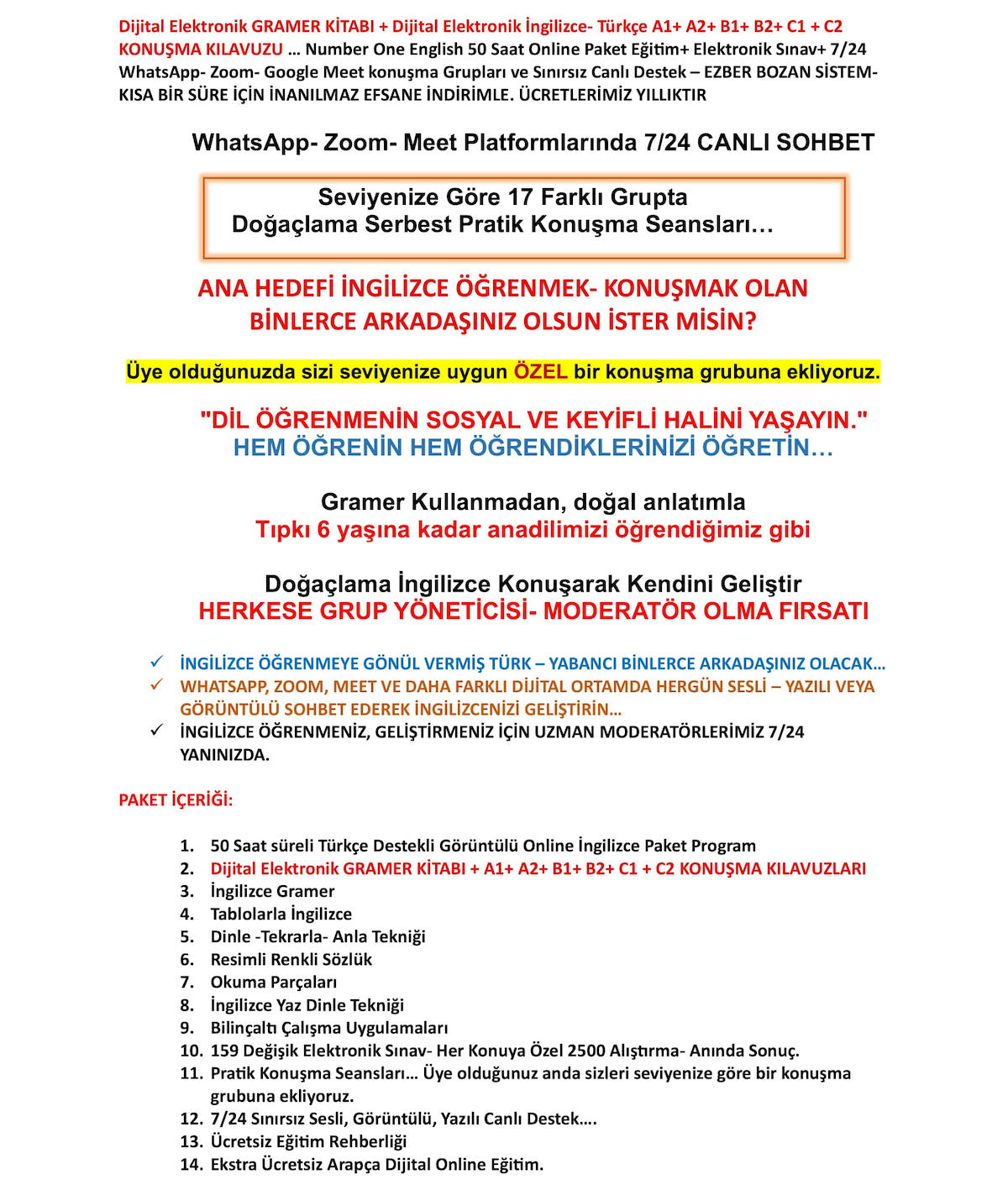Dijital Elektronik GRAMER KİTABI+ A1+A2+B1+ B2+C1+ C2 KONUŞMA KILAVUZLARI+50 Saat Online Paket Eğitim+ Elektronik Sınav+ 7/24 WhatsApp- Zoom- Google Meet konuşma Grupları+ Canlı Destek- EZBER BOZAN SİSTEM- EFSANE İNDİRİM. FİYATLARIMIZ 1 YILLIKTIR