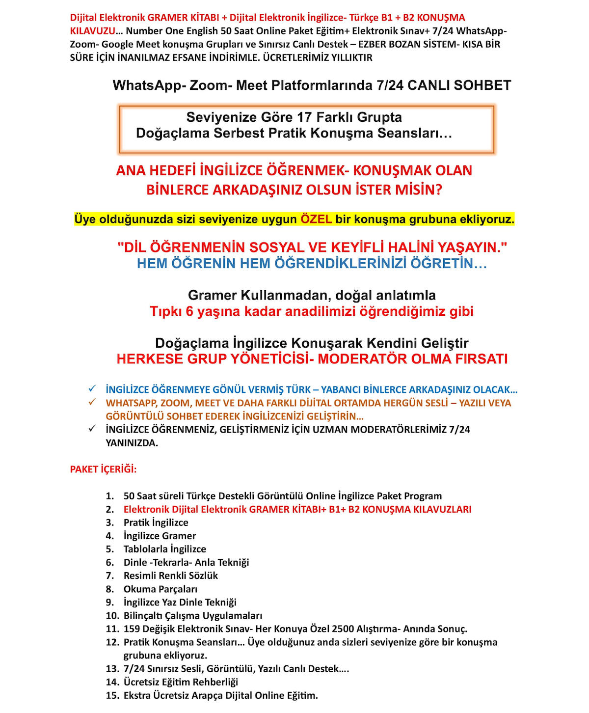 Dijital Elektronik GRAMER KİTABI+ B1+B2 KONUŞMA KILAVUZU. Number One English 50 Saat Online Paket Eğitim+ Elektronik Sınav+ 7/24 WhatsApp- Zoom- Google Meet konuşma Grupları + Canlı Destek- EZBER BOZAN SİSTEM- EFSANE İNDİRİM. FİYATLARIMIZ 1 YILLIKTIR
