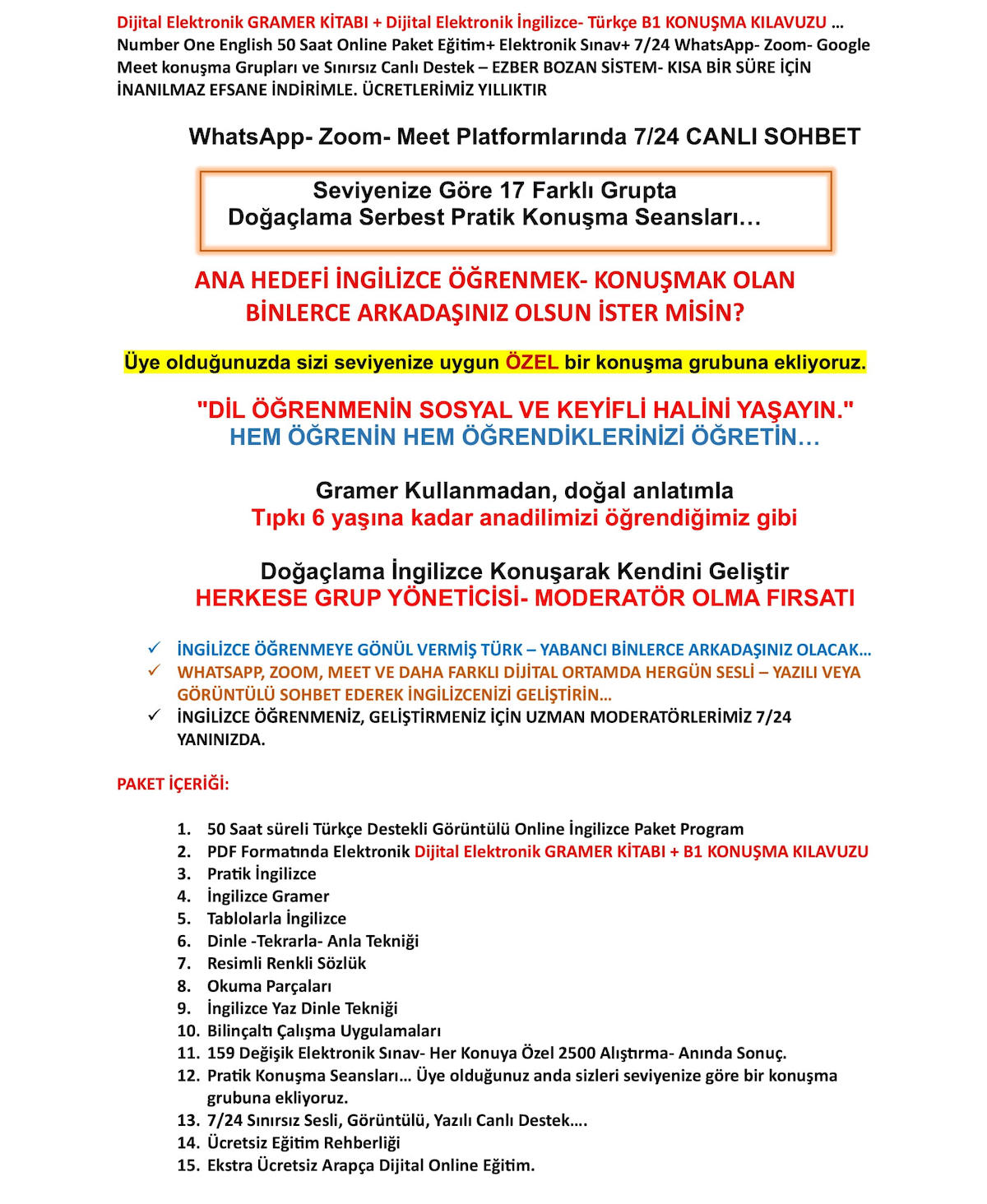 Dijital Elektronik GRAMER KİTABI+B1 KONUŞMA KILAVUZU … Number One English 50 Saat Online Paket Eğitim+ Elektronik Sınav+ 7/24 WhatsApp- Zoom- Google Meet konuşma Grupları ve Canlı Destek – EZBER BOZAN SİSTEM- EFSANE İNDİRİMLE YILLIK 99-TL