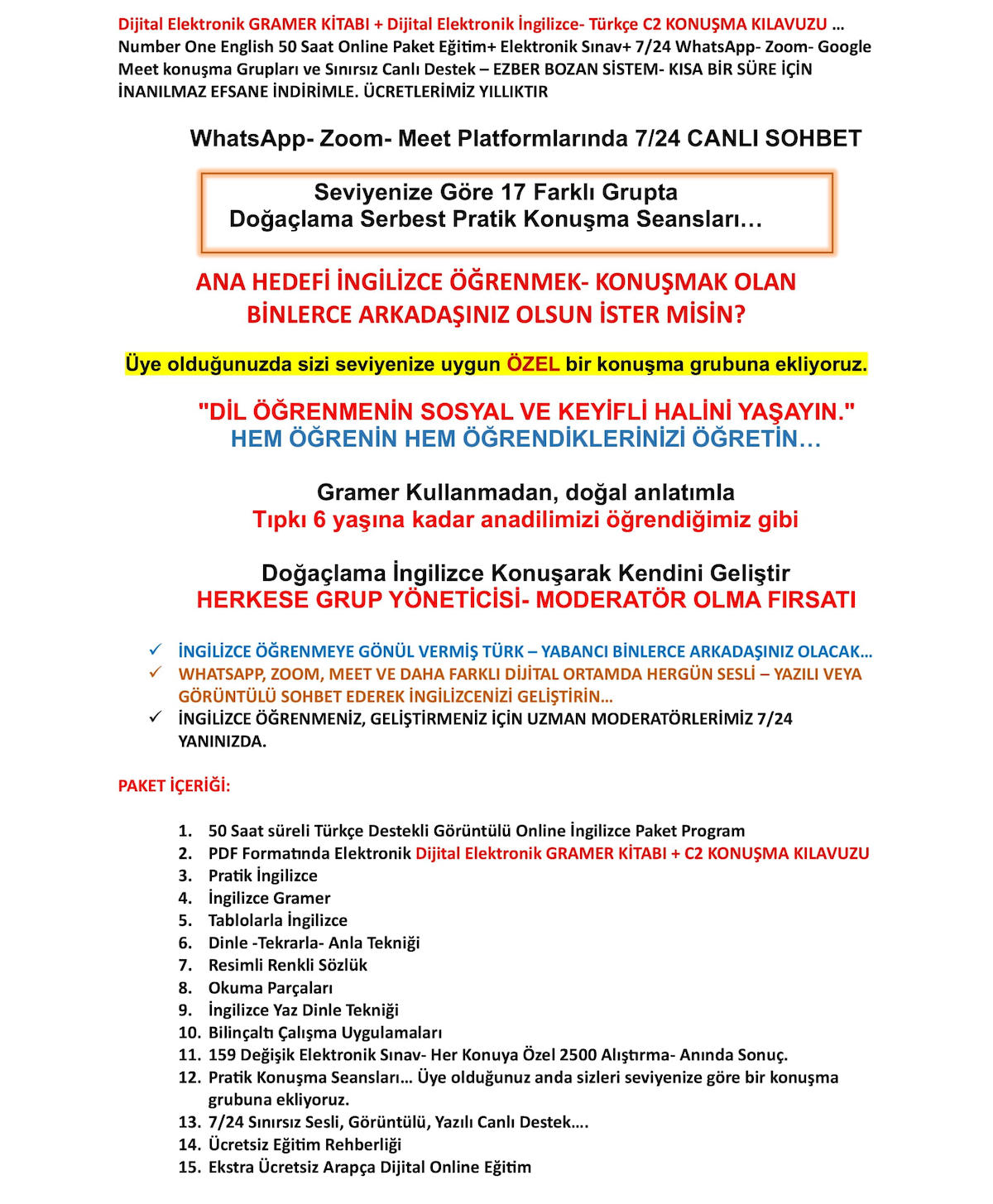 Dijital Elektronik GRAMER KİTABI+C2 KONUŞMA KILAVUZU … Number One English 50 Saat Online Paket Eğitim+ Elektronik Sınav+ 7/24 WhatsApp- Zoom- Google Meet konuşma Grupları ve Canlı Destek– EZBER BOZAN SİSTEM- EFSANE İNDİRİM... FİYATLARIMIZ 1 YILLIKTIR