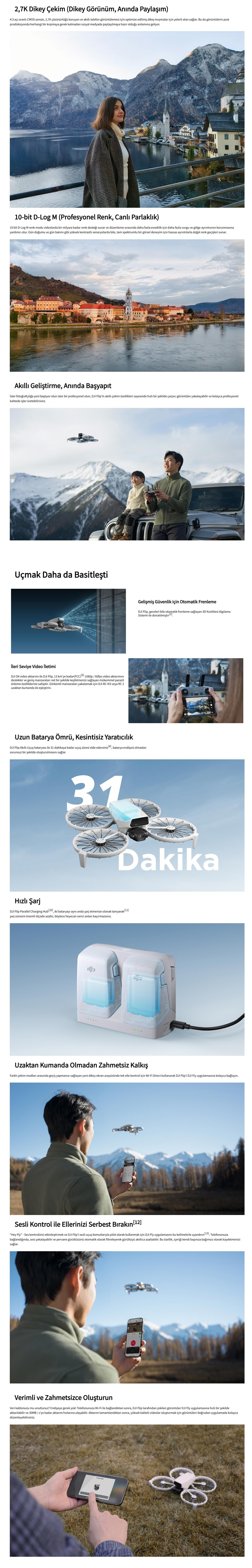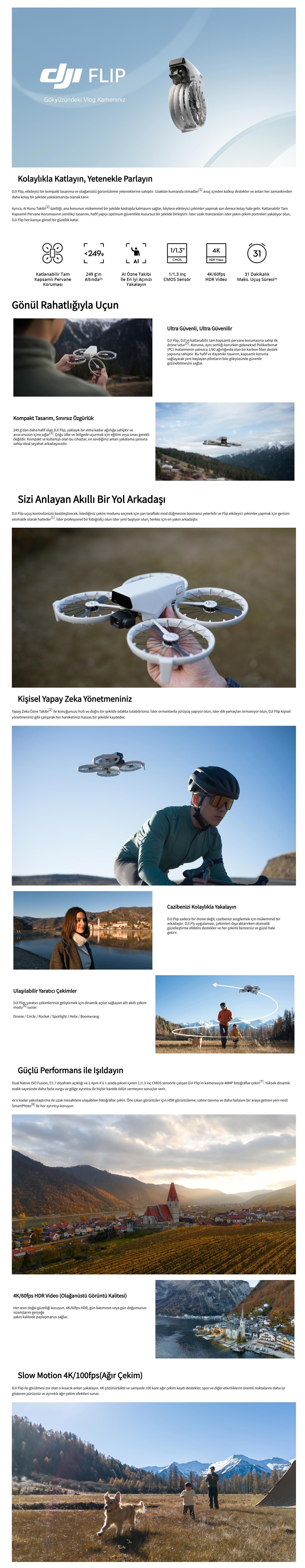 Kolaylıkla Katlayın, Yetenekle ParlayınDJI Flip, etkileyici bir kompakt tasarıma ve olağanüstü görüntüleme yeteneklerine sahiptir. Uzaktan kumanda olmadan[1] avuç içinden kalkışı destekler ve anları her zamankinden daha kolay bir şekilde yakalamanıza olanak tanır.Ayrıca, AI Konu Takibi[2] özelliği, ana konunun mükemmel bir şekilde kadrajda kalmasını sağlar, böylece etkileyici çekimler yapmak son derece kolay hale gelir. Katlanabilir Tam Kapsamlı Pervane Korumasının yenilikçi tasarımı, hafif yapıyı optimum güvenlikle kusursuz bir şekilde birleştirir. İster uzak manzaraları ister yakın çekim portreleri yakalıyor olun, DJI Flip her kareye görsel bir güzellik katar. Gönül Rahatlığıyla Uçun Ultra Güvenli, Ultra Güvenilir DJI Flip, DJI'ın katlanabilir tam kapsamlı pervane korumasına sahip ilk drone'udur[5]. Koruma, aynı sertliği korurken geleneksel Polikarbonat (PC) malzemenin yalnızca 1/60 ağırlığında olan bir karbon fiber destek yapısına sahiptir. Bu hafif ve dayanıklı tasarım, kapsamlı koruma sağlayarak yeni başlayan pilotların bile gökyüzünde güvenle gezinebilmesini sağlar. Kompakt Tasarım, Sınırsız Özgürlük 249 g'dan daha hafif olan DJI Flip, yaklaşık bir elma kadar ağırlığa sahiptir ve avucunuzun içine sığar[3]. Çoğu ülke ve bölgede uçurmak için eğitim veya sınav gerekli değildir. Kompakt ve kullanışlı olan bu cihazlar, en sevdiğiniz anları yakalama şansına sahip ideal seyahat arkadaşınızdır. Sizi Anlayan Akıllı Bir Yol ArkadaşıDJI Flip uçuş kontrolünüzü basitleştirecek. İstediğiniz çekim modunu seçmek için yan taraftaki mod düğmesine basmanız yeterlidir ve Flip etkileyici çekimler yapmak için gerisini otomatik olarak halleder[1]. İster profesyonel bir fotoğrafçı olun ister yeni başlıyor olun, herkes için en yakın arkadaştır. Kişisel Yapay Zeka YönetmeninizYapay Zeka Özne Takibi[2] ile konuğunuzu hızlı ve doğru bir şekilde odakta tutabilirsiniz. İster ormanlarda yürüyüş yapıyor olun, ister dik yamaçları tırmanıyor olun, DJI Flip kişisel yönetmeniniz gibi çalışarak her hareketinizi hassas bir şekilde kaydeder. Cazibenizi Kolaylıkla Yakalayın DJI Flip sadece bir drone değil; cazibenizi sergilemek için mükemmel bir arkadaştır. DJI Fly uygulaması, çekimleri dışa aktarırken otomatik güzelleştirme efektini destekler ve her çekimi benzersiz ve güzel hale getirir. Ulaşılabilir Yaratıcı Çekimler DJI Flip, yaratıcı çekimlerinizi geliştirmek için dinamik açılar sağlayan altı akıllı çekim modu[6] sunar.Dronie / Circle / Rocket / Spotlight / Helix / Boomerang Güçlü Performans ile IşıldayınDual Native ISO Fusion, f/1.7 diyafram açıklığı ve 2.4μm 4'ü 1 arada piksel içeren 1/1.3 inç CMOS sensörle çalışan DJI Flip'in kamerasıyla 48MP fotoğraflar çekin[7]. Yüksek dinamik aralık sayesinde daha fazla vurgu ve gölge ayrıntısı ile hiçbir karede ödün vermeyen sonuçlar verir.4x'e kadar yakınlaştırma ile uzak mesafelere ulaşabilen fotoğraflar çekin. Öne çıkan görüntüler için HDR görüntüleme, sahne tanıma ve daha fazlasını bir araya getiren yeni nesil SmartPhoto[8] ile her ayrıntıyı koruyun. 4K/60fps HDR Video (Olağanüstü Görüntü Kalitesi) Her anın doğal güzelliği koruyun. 4K/60fps HDR, gün batımının veya gün doğumunun nüanslarını gerçeğeyakın kalitede paylaşmanızı sağlar. Slow Motion 4K/100fps(Ağır Çekim)DJI Flip ile görülmesi zor olan o kısacık anları yakalayın. 4K çözünürlükte ve saniyede 100 kare ağır çekim kaydı destekler, spor ve diğer etkinliklerin önemli noktalarını daha iyi gösteren pürüzsüz ve ayrıntılı ağır çekim efektleri sunar. 2,7K Dikey Çekim (Dikey Görünüm, Anında Paylaşım)4:3 açı oranlı CMOS sensör, 2,7K çözünürlüğü koruyan ve akıllı telefon görüntülemesi için optimize edilmiş dikey kırpmalar için yeterli alan sağlar. Bu da görüntülerin post prodüksiyonda herhangi bir kırpmaya gerek kalmadan sosyal medyada paylaşılmaya hazır olduğu anlamına geliyor. 10-bit D-Log M (Profesyonel Renk, Canlı Parlaklık)10 bit D-Log M renk modu videolarda bir milyara kadar renk desteği sunar ve düzenleme sırasında daha fazla esneklik için daha fazla vurgu ve gölge ayrıntısının korunmasına yardımcı olur. Gün doğumu ve gün batımı gibi yüksek kontrastlı senaryolarda bile, tam spektrumlu bir görsel deneyim için hassas ayrıntılarla doğal renk geçişleri sunar. Akıllı Geliştirme, Anında Başyapıtİster fotoğrafçılığa yeni başlıyor olun ister bir profesyonel olun, DJI Flip'in akıllı çekim özellikleri sayesinde hızlı bir şekilde çarpıcı görüntüler yakalayabilir ve kolayca profesyonel kalitede işler üretebilirsiniz. Uçmak Daha da Basitleşti Gelişmiş Güvenlik için Otomatik Frenleme DJI Flip, geceleri bile otomatik frenleme sağlayan 3D Kızılötesi Algılama Sistemi ile donatılmıştır[2]. İleri Seviye Video İletimi DJI O4 video aktarımı ile DJI Flip, 13 km'ye kadar(FCC)[9] 1080p / 60fps video aktarımını destekler ve geniş manzaraları net bir şekilde keşfetmenizi sağlayan mükemmel parazit önleme özelliklerine sahiptir. Görkemli manzaraları yakalamak için DJI RC-N3 veya RC 2 uzaktan kumanda ile eşleştirin. Uzun Batarya Ömrü, Kesintisiz YaratıcılıkDJI Flip Akıllı Uçuş bataryası ile 31 dakikaya kadar uçuş süresi elde edersiniz[4], batarya endişesi olmadansorunsuz bir şekilde oluşturulmasını sağlar. Hızlı ŞarjDJI Flip Parallel Charging Hub[10], iki bataryayı aynı anda şarj etmenize olanak tanıyarak[11]şarj süresini önemli ölçüde azaltır, böylece heyecan verici anları kaçırmazsınız. Uzaktan Kumanda Olmadan Zahmetsiz KalkışFarklı çekim modları arasında geçiş yapmanızı sağlayan yeni dikey ekran arayüzünde tek elle kontrol için Wi-Fi Direct kullanarak DJI