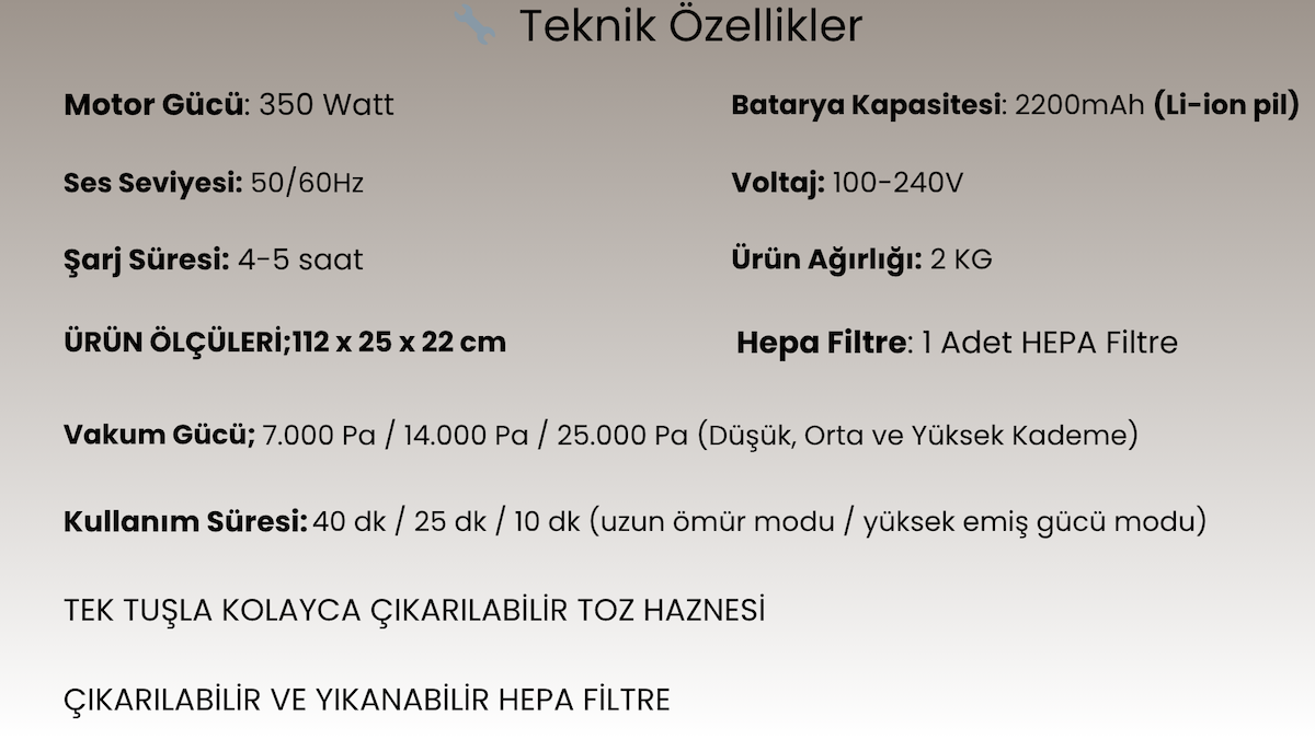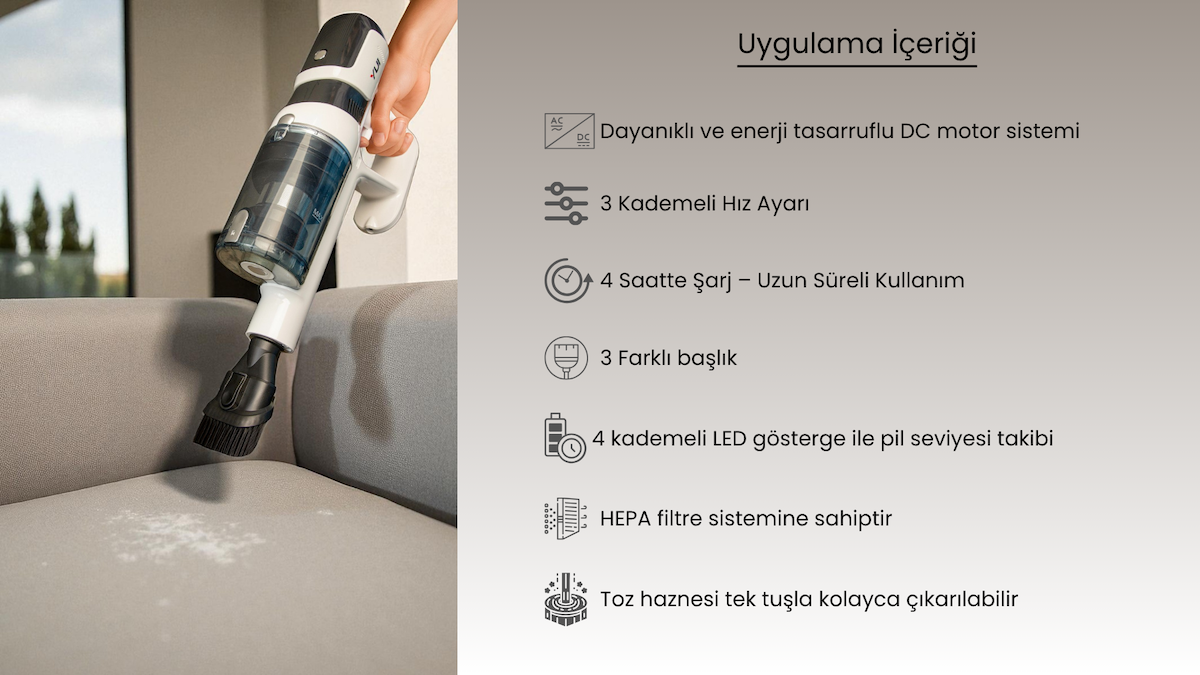 DS17 Şarjlı Dikey Süpürge HEPA Filtre 3 Kademeli Hız Ayarı;