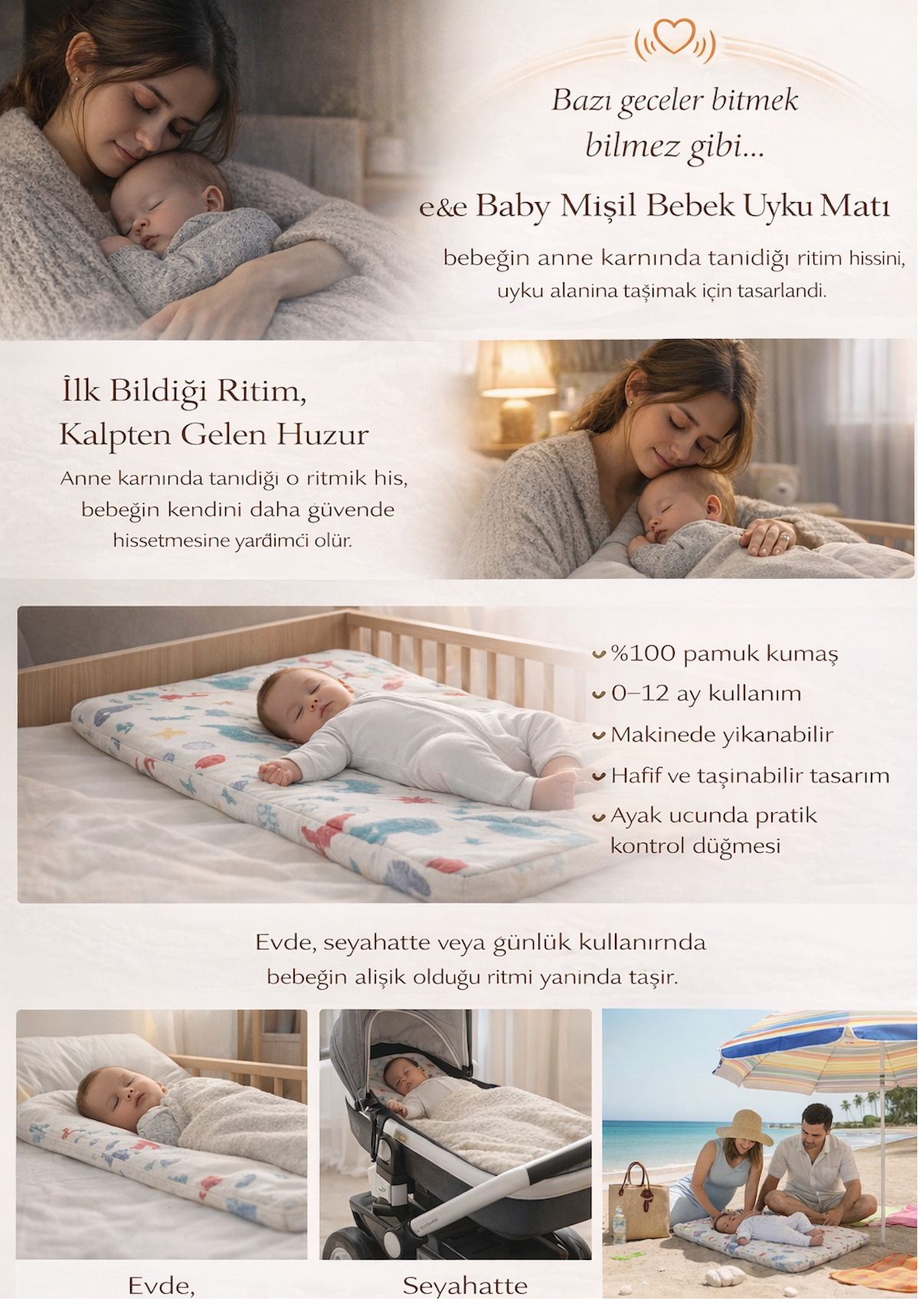 🍼 E&e Baby Mışıl Bebek Uyku Matı Anne karnı hissiyle rahatlayan, dakikalar içinde uykuya geçen bebekler için… Anne karnındaki doğal ritmi taklit eden titreşim sistemi sayesinde bebeğe anne karnında hissettirerek anında rahatlama sağlar. Bu özel titreşim, bebeğin kendini güvende hissetmesine yardımcı olur ve huzursuzluğu azaltarak kolayca uykuya geçmesini destekler. Sünger yapısındaki özel hava kanalları sayesinde bebeğe sürekli hava akışı sağlar, nefes alabilir yüzeyi ile daha güvenli ve konforlu bir uyku ortamı sunar. Karın bölgesindeki özel tasarımı, bebeğin karnına nazik masaj yaparak gazın rahat çıkmasına yardımcı olur ve kolik kaynaklı ağlamaları azaltmayı destekler. Titreşimden oluşan beyaz gürültü, bebeğe araba ile gezdiriliyormuş hissi vererek sakinleşmesini sağlar ve uykuya geçiş süresini kısaltır. Taşıma çantası sayesinde evde ya da dışarıda her yerde kullanabilirsiniz: beşikte, salonda, ana kucağında, pusette veya anne-baba yanında. Alt değiştirme sırasında bile masaj özelliği sayesinde bebeğin sakin kalmasına yardımcı olur. Yüzeyi %100 pamuk kumaş ile kaplıdır. Yumuşak dokusu bebeğin hassas cildine uygundur ve yıkanabilir yapısıyla hijyenik kullanım sunar. 🌿 Öne Çıkan Özellikler Anne karnı hissi veren titreşim sistemi Dakikalar içinde uykuya geçiş desteği Sünger içi hava kanalları ile sürekli hava akışı Nefes alabilir yapı ile güvenli kullanım Karın bölgesinde rahatlatıcı masaj etkisi Kolik ve gaz rahatlatmaya yardımcı Titreşim kaynaklı beyaz gürültü %100 pamuk, yumuşak ve yıkanabilir yüzey Taşınabilir tasarım + taşıma çantası 🔧 Teknik Bilgiler Ölçüler: 50 × 70 cm 2 adet AA kalem pil ile çalışır Piller pakete dahil değildir