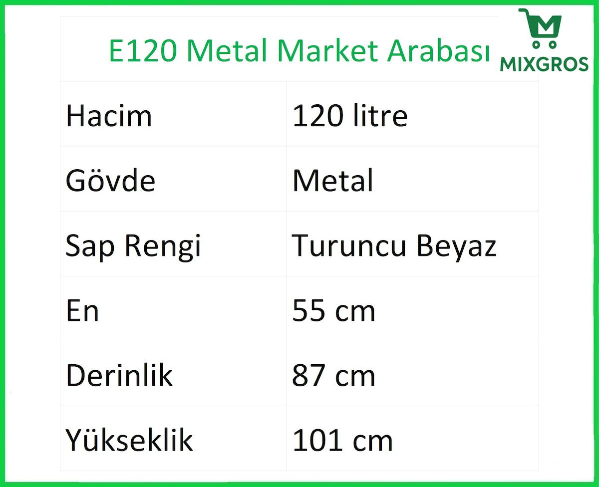 E120 metal market arabaları 75, 100 ve 120 litre olarak üretilmektedir. Sap kısımları standart olarak kırmızı ve turuncu renklerde sunulan E120 metal market arabası, özel istek doğrultusunda farklı renk ve ölçülerde üretilebilmektedir. E120 metal market arabasının sap kısımlarını özel istek doğrultusunda firma mağaza logonuz ile baskılı alma seçeneği de bulunmaktadır.