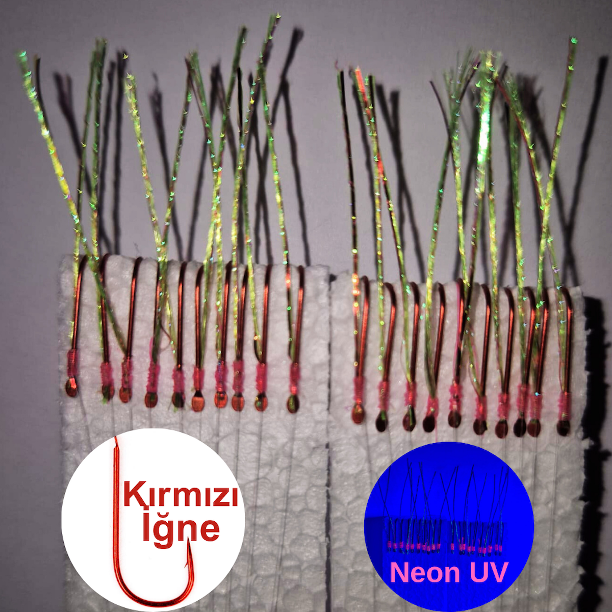 Eagenset Çapari, İstavrit Çaparisi, 15x12 Beden, Ultraviyole Uv Neon Fıstık Yeşili - Kırmızı Sim, 11 No Kırmızı İğne, 10 İğneli 2li Paket
