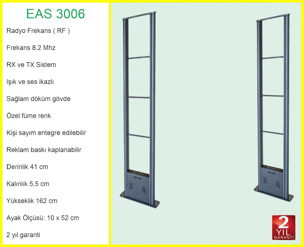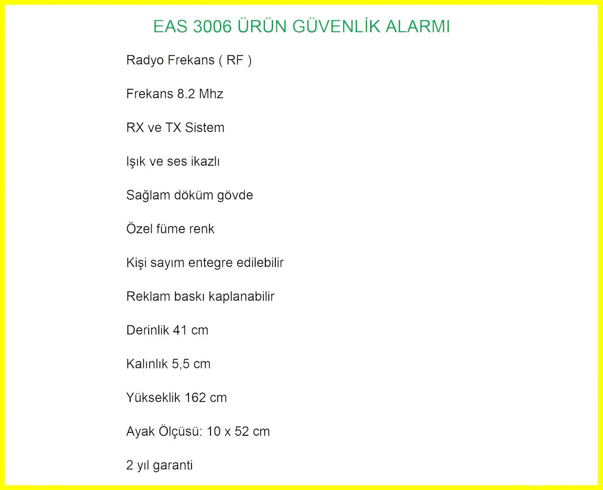 Secadoor EAS 3006 mağaza hırsız ürün güvenlik sistemi, özellikle süpermarketler için tasarlanmıştır. Döküm gövdeden üretilmiştir. Secadoor EAS 3006 ürün güvenlik sistemi, sağlam ve dayanıklı gövdeden üretilmiş bir ürün güvenlik anteni... RX ve TX olarak takım olarak sunulmaktadır. Oluşturulan koridorlardan geçen 8,2 Mhz alarm etiketlerini algılayarak alarm vermektedir. Antenler arası koridorların genişliği ve alarm etiketlerini yakalama performansı, kullanılan alarm etiketlerinin büyüklüğü ya da küçüklüğü ile doğru orantılıdır. Alarm etiketleri ne kadar büyük ise yakalama performansı daha etkili olacaktır ve de antenler arası koridorların daha geniş tutulmasına imkân sağlayacaktır. Özellikle market, süpermarket, hipermarket ve yapı market vb. alışverişin yoğun olduğu, market arabalarının sıklıkla kullanıldığı alanlarda, EAS 3006 darbelere karşı oldukça dayanıklıdır. Bu konuda da iddialı yapısı ile adından sıkça bahsettirmektedir. Sizlerin de mağazanızda bulunan ürün güvenlik antenlerinin kırılması, yıkılması vb. gibi sorunlar ile karşılaşmak istemiyorsanız, EAS 3006 ürün güvenlik antenlerini kurun, rahat edin... Gözünüz arkada kalmasın...