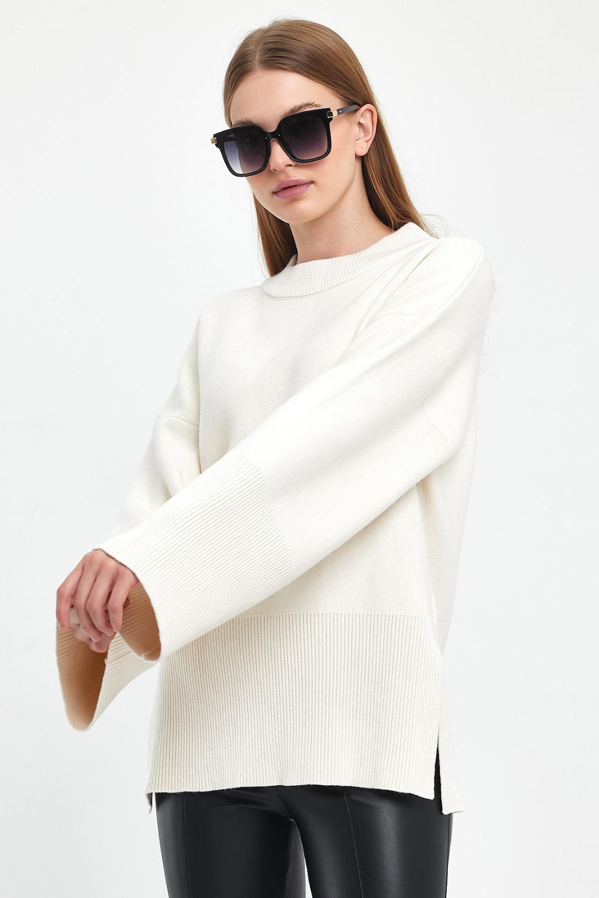 Ekru Geniş Kol Detaylı Triko Kazak