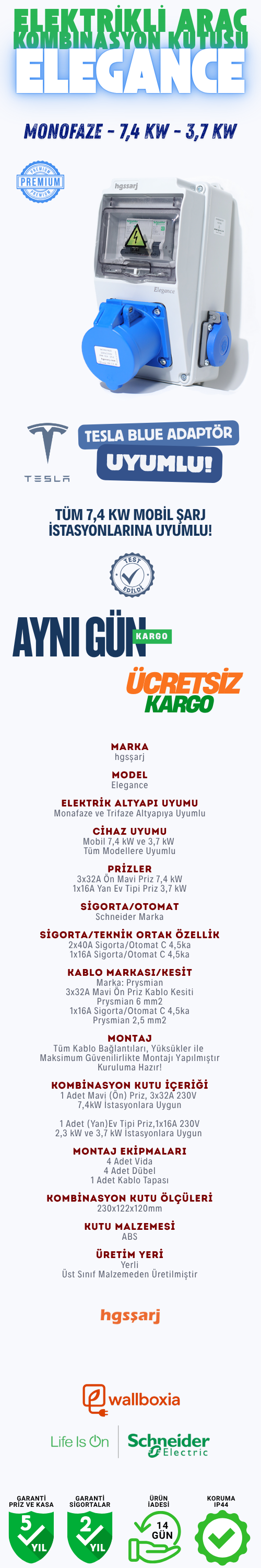 Elegance, Monofaze Elektrikli Araç Kombinasyon Kutusu, Tesla Blue Adaptöre Uyumlu, 3x32A + 1x16A - Schneider Marka Sigorta Grubu - 5 Yıl Garanti
