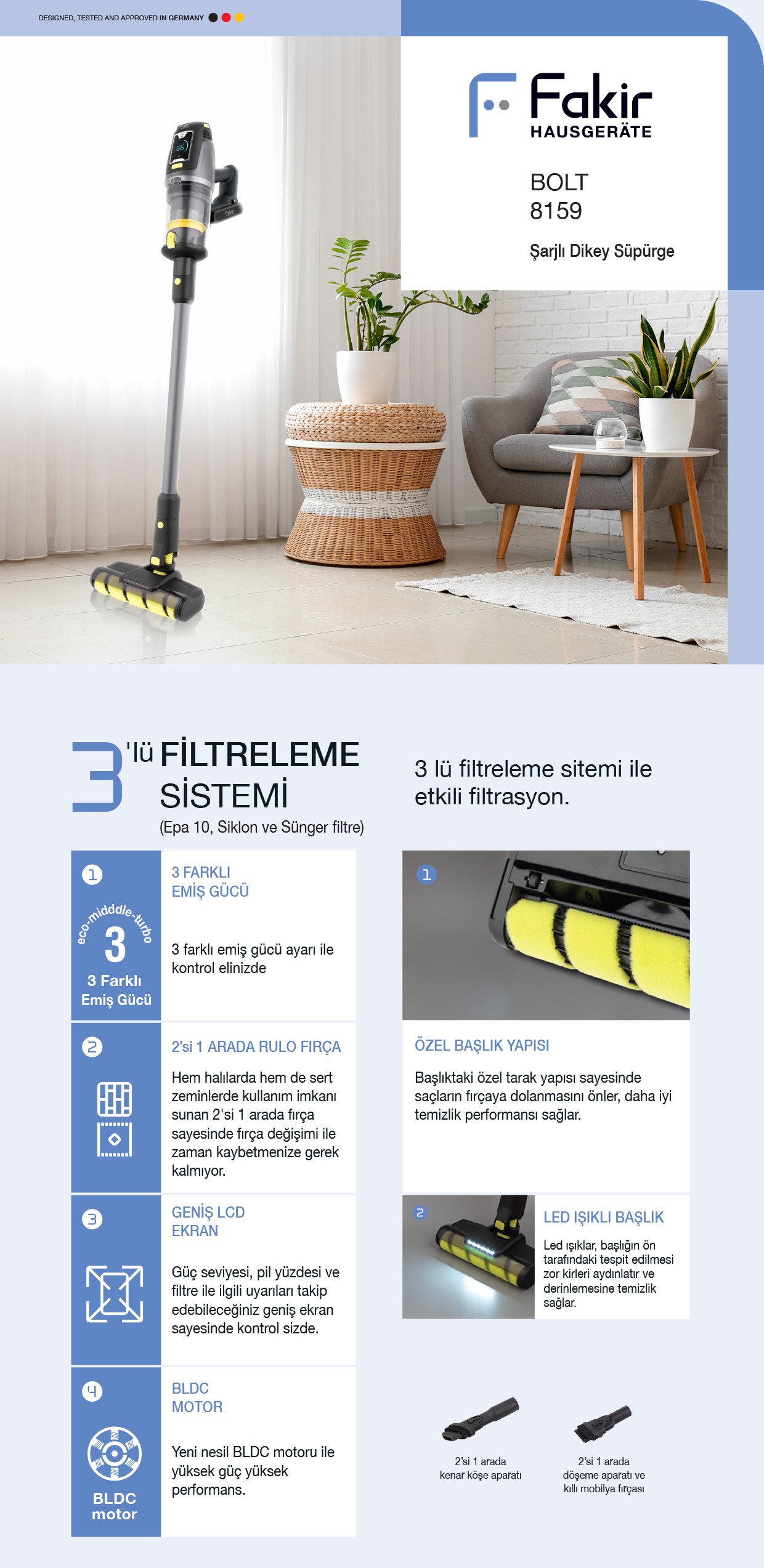 Model Bolt 8159 Yellow Poison Güç 400 W, yüksek devirli BLDC motor Vakum Gücü 20 kPa/104 Airwatt Filtreleme Sistemi 3’lü filtreleme (Epa10, Siklon ve Sünger Filtre) Emiş Gücü 3 farklı ayar (eco-middle-turbo) Ekran Geniş LCD ekranda kullanım süresi ve emiş gücü göstergesi LED Işıklı Başlık Var Toz Hazne Kapasitesi 0,6 L toz haznesi (0,3 L kullanılabilir maks. toz hazne kapasitesi) Kullanım Zamanı Yüksek:≥=6.5 dk, Orta:≥=14.5 dk, Düşük:≥=38 dk Elde Kullanım Zamanı Yüksek:≥=8 dk, Orta:≥=15.5 dk, Düşük:≥=45 dk Aksesuarlar Hassas Döşeme Aparatı, Kenar-Köşe Aparatı, İkisi bir arada döşeme aparatı ve kıllı mobilya fırçası |