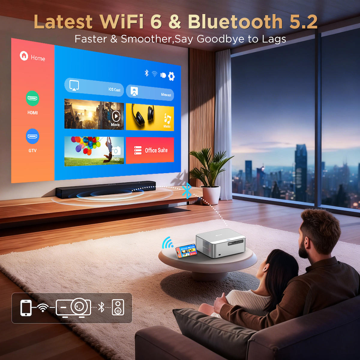 FunFlix P7 Wi-Fi 6 Teknolojisine sahiptir, isterseniz Apple ürünlerinden Mac Bilgisayar, iPad Tablet, iPhone telefon farketmeksizin kablosuz aktarım yapmanızı sağlar. Dilerseniz Android Tablet Telefonlarınızdan yada Windows bilgisayarınızdan Miracast ile kablosuz aktarım yapabilirsiniz.
