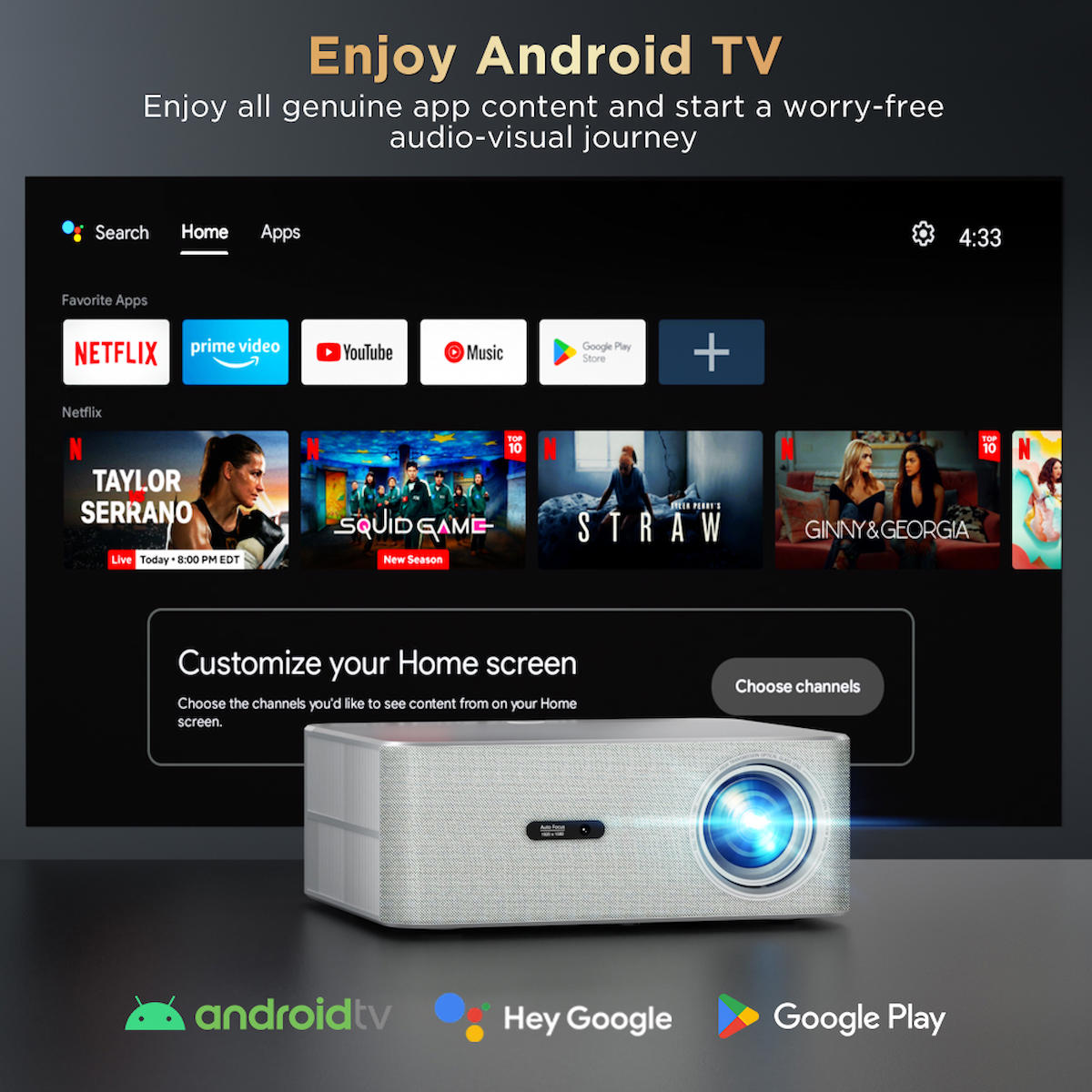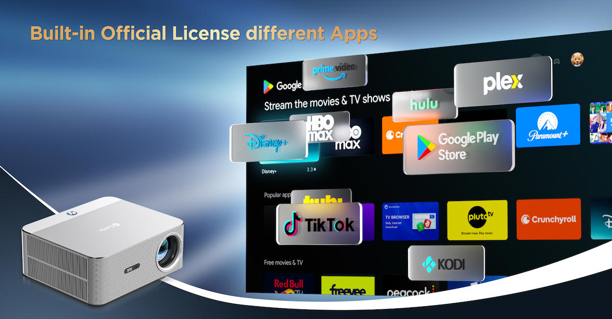 FunFlix P7 Akıllı Projeksiyondur, Android TV’ye sahiptir, dahili Android 11 işletim sistemiyle gelir, düzenli güncelleme alır ve Android versiyonu yükseltilebilir açtığınız gibi akıllı uygulama arayüzü sizi karşılar, kablosuz ağa bağlanarak üye olduğunuz yayın platformlarını izlemeye başlayabilirsiniz. Lisanslı Android altyapı sayesinde tüm platformlar orijinal çözünürlükte izlenebilir. Netflix, Disney, Prime, Exxen, HBO Max, Gain, Bein, TOD gibi yüzlerce uygulama sizi bekliyor.