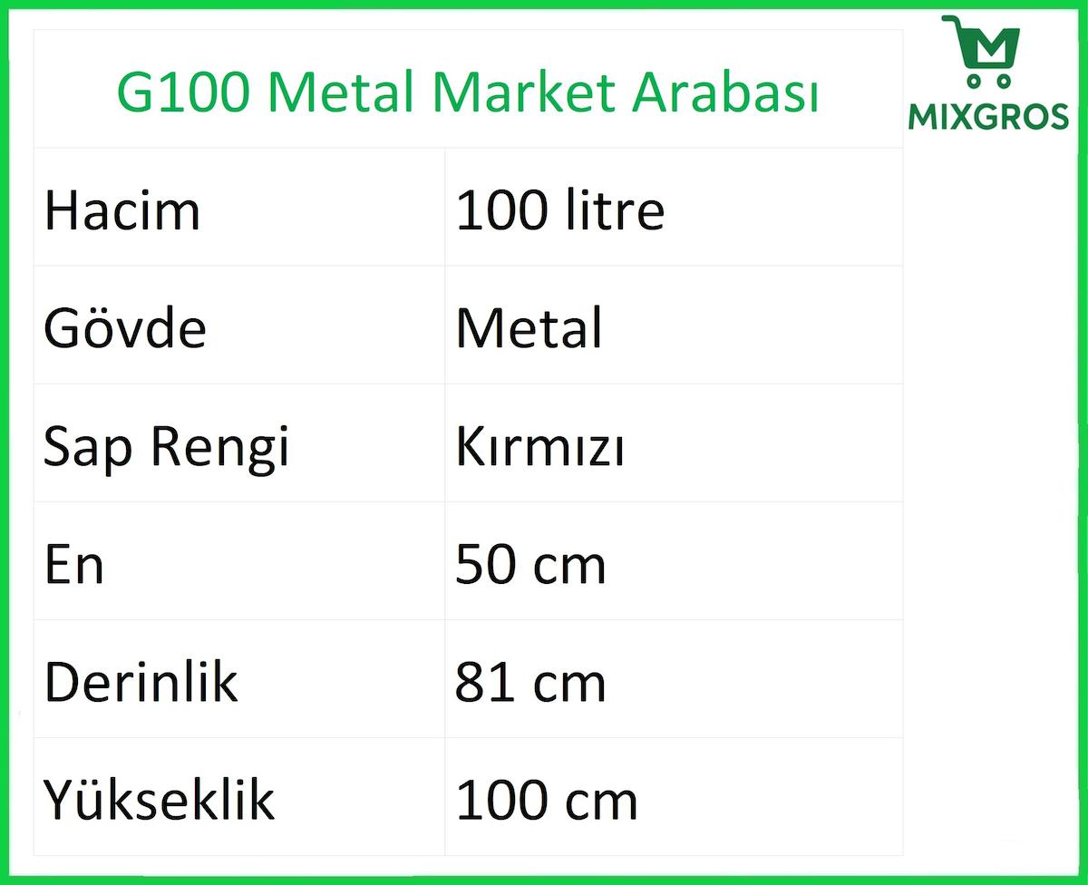 G100 100 Litre Metal Market Arabasının özellikleri ve açıklamaları aşağıda verilmiştir. Farklı ölçü seçenekleri ve daha fazla bilgi için mağazamızı ziyaret edebilirsiniz.