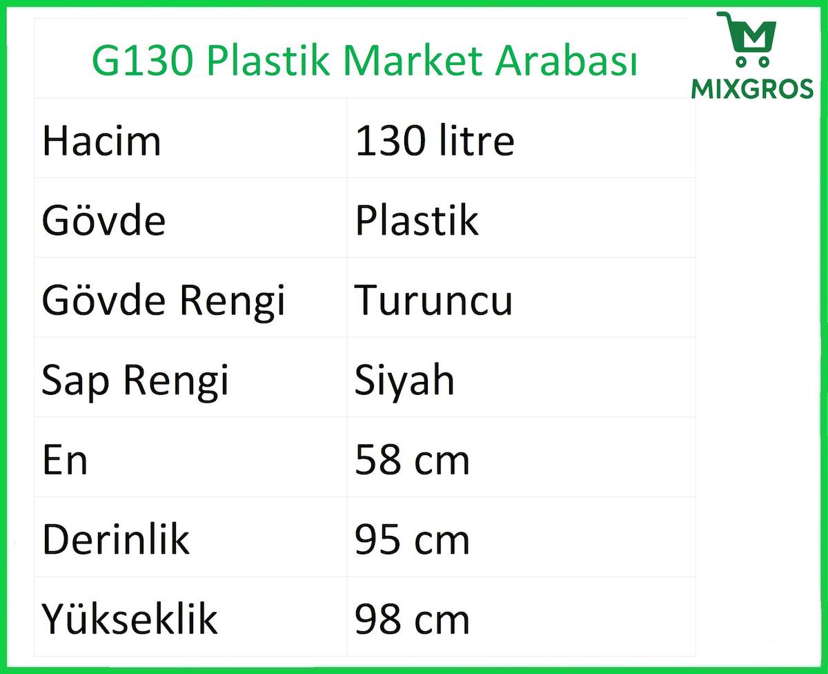 G130 plastik market arabaları 100, 130 ve 150 litre olarak üretilmektedir. Standart olarak kırmızı, turuncu, yeşil ve mavi renklerde sunulan G130 plastik market arabası, özel istek doğrultusunda farklı renk ve ölçülerde üretilebilmektedir. G130 plastik market arabasının sap kısımlarını özel istek doğrultusunda firma mağaza logonuz ile baskılı alma seçeneği de bulunmaktadır.