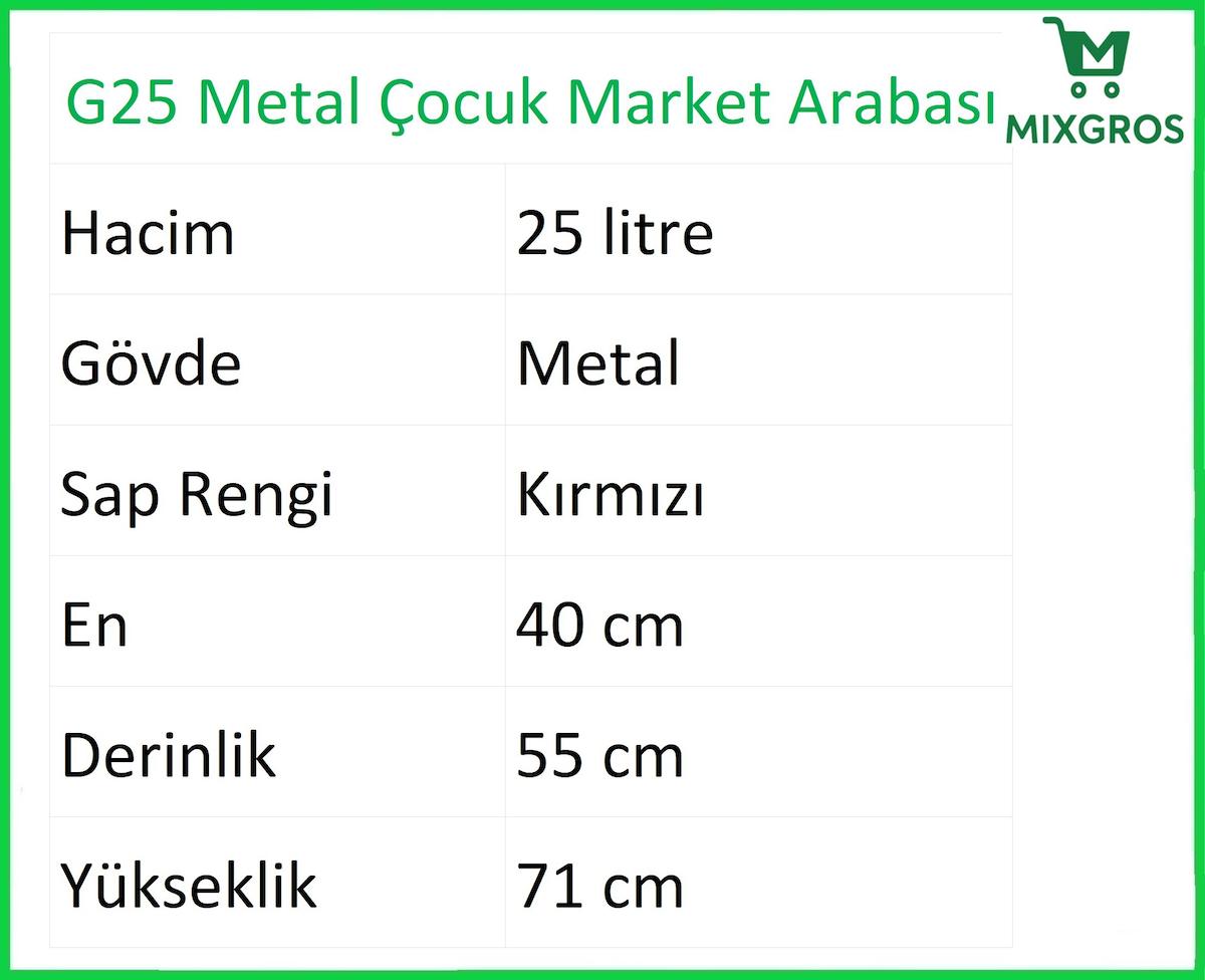 G25 metal çocuk market arabası 25 litre olarak üretilmektedir. Sap kısımları standart olarak kırmızı ve turuncu renklerde sunulan G25 metal çocuk market arabası, özel istek doğrultusunda farklı renk ve ölçülerde üretilebilmektedir. G25 metal çocuk market arabasının sap kısımlarını özel istek doğrultusunda firma mağaza logonuz ile baskılı alma seçeneği de bulunmaktadır.