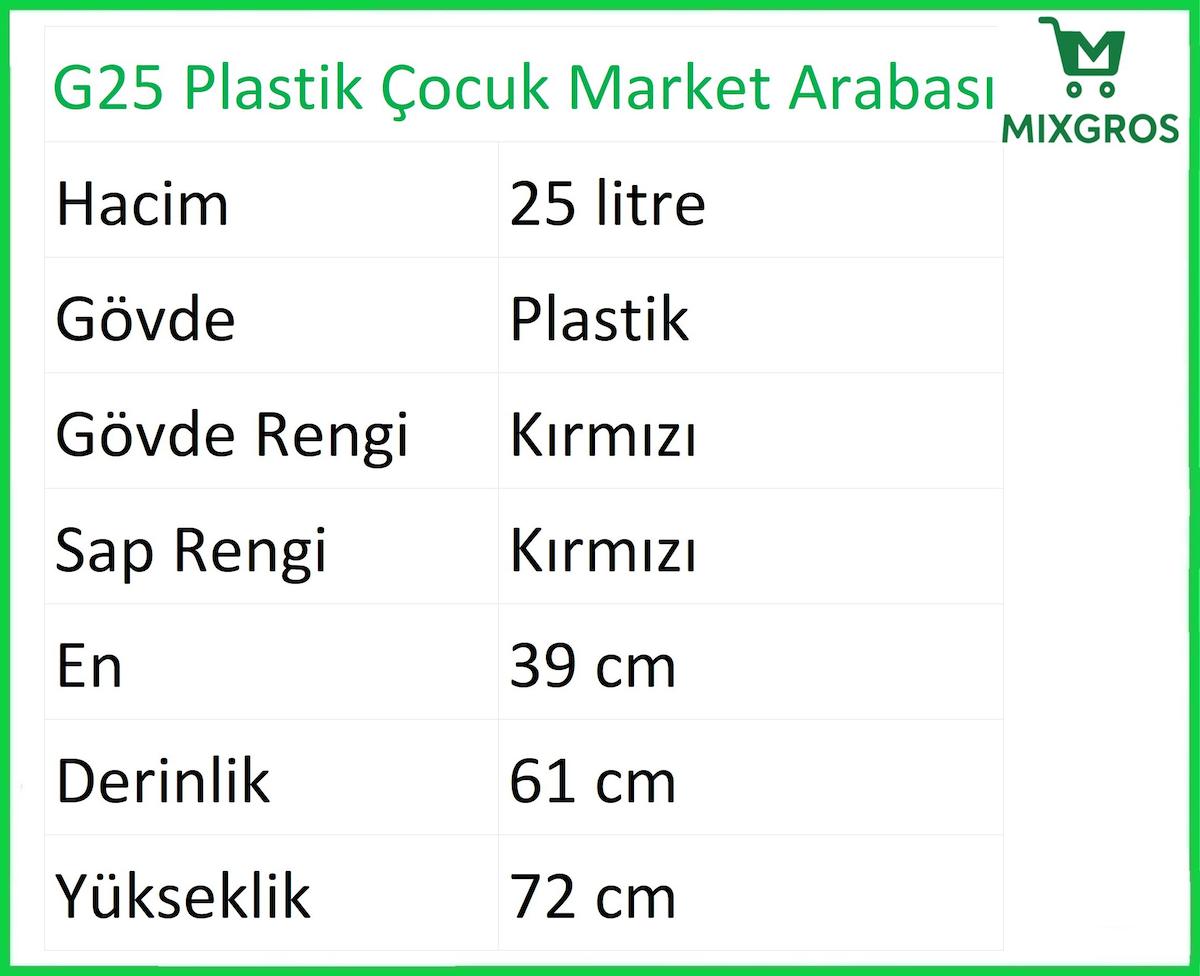 G25 plastik çocuk market arabası 25 litre olarak üretilmektedir. Standart olarak kırmızı ve mavi renkte sunulan G25 plastik çocuk market arabası, özel istek doğrultusunda farklı renk ve ölçülerde üretilebilmektedir. G25 plastik çocuk market arabasının sap kısımlarını özel istek doğrultusunda firma mağaza logonuz ile baskılı alma seçeneği de bulunmaktadır.