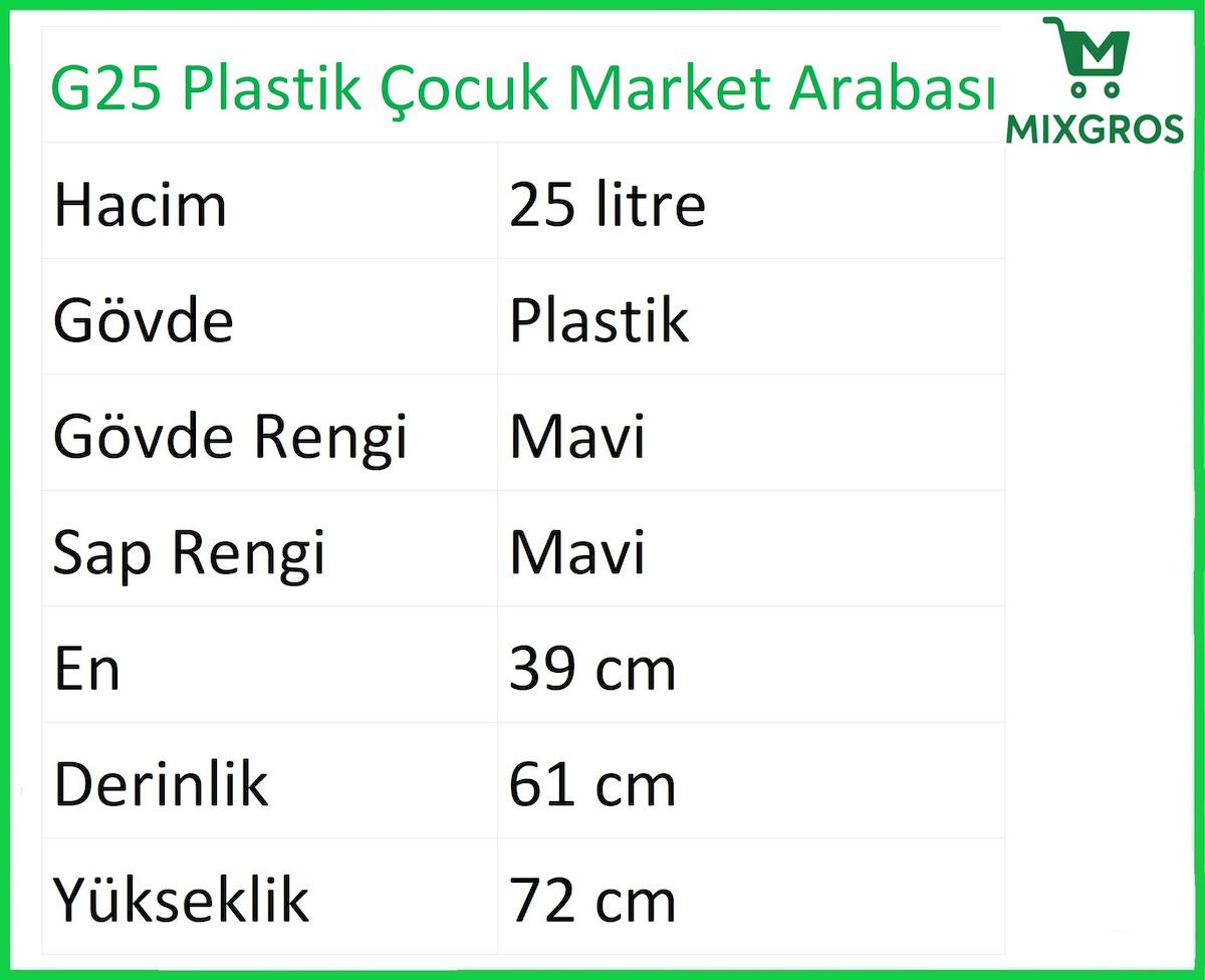 G25 plastik çocuk market arabası 25 litre olarak üretilmektedir. Standart olarak kırmızı ve mavi renkte sunulan G25 plastik çocuk market arabası, özel istek doğrultusunda farklı renk ve ölçülerde üretilebilmektedir. G25 plastik çocuk market arabasının sap kısımlarını özel istek doğrultusunda firma mağaza logonuz ile baskılı alma seçeneği de bulunmaktadır.