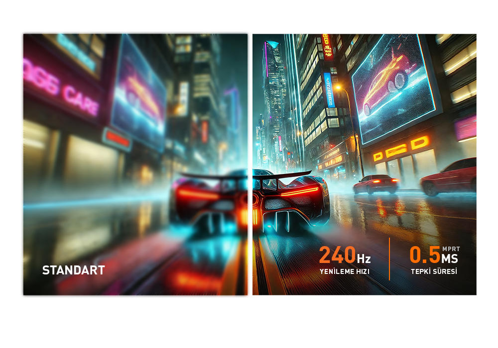 240Hz yenileme hızı ve 0.5ms (MPRT) tepki süresi gecikmeyi ve hareket bulanıklığını en aza indirir süper hızlı akıcı oyun performansı sunar.