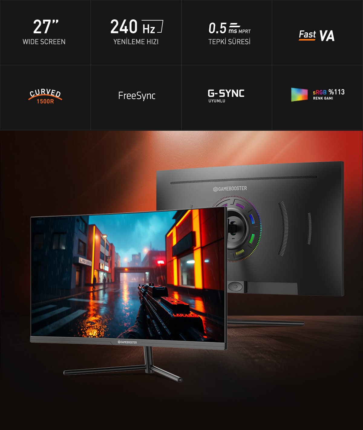 GameBooster 27” oyun monitörü Fast VA paneli, 240 Hz yenileme hızı ve 0.5ms (MPRT) tepki süresi gecikmeyi ve hareket bulanıklığını en aza indirir süper hızlı akıcı oyun performansı sunar. Fast VA panel teknolojisi, 120% sRGB, HDR desteği, 300 cd/m² parlaklık ve FHD çözünürlük , siyah ve beyaz dengesini en iyi şekilde sağlar ve daha zengin renklerle daha net film ve oyun performansı sunar. G-Sync Uyumluluğu ve AMD FreeSync Teknolojisi desteği ile yırtılma ve takılma sorunları olmadan keyifli oyun deneyiminin tadını çıkarın.