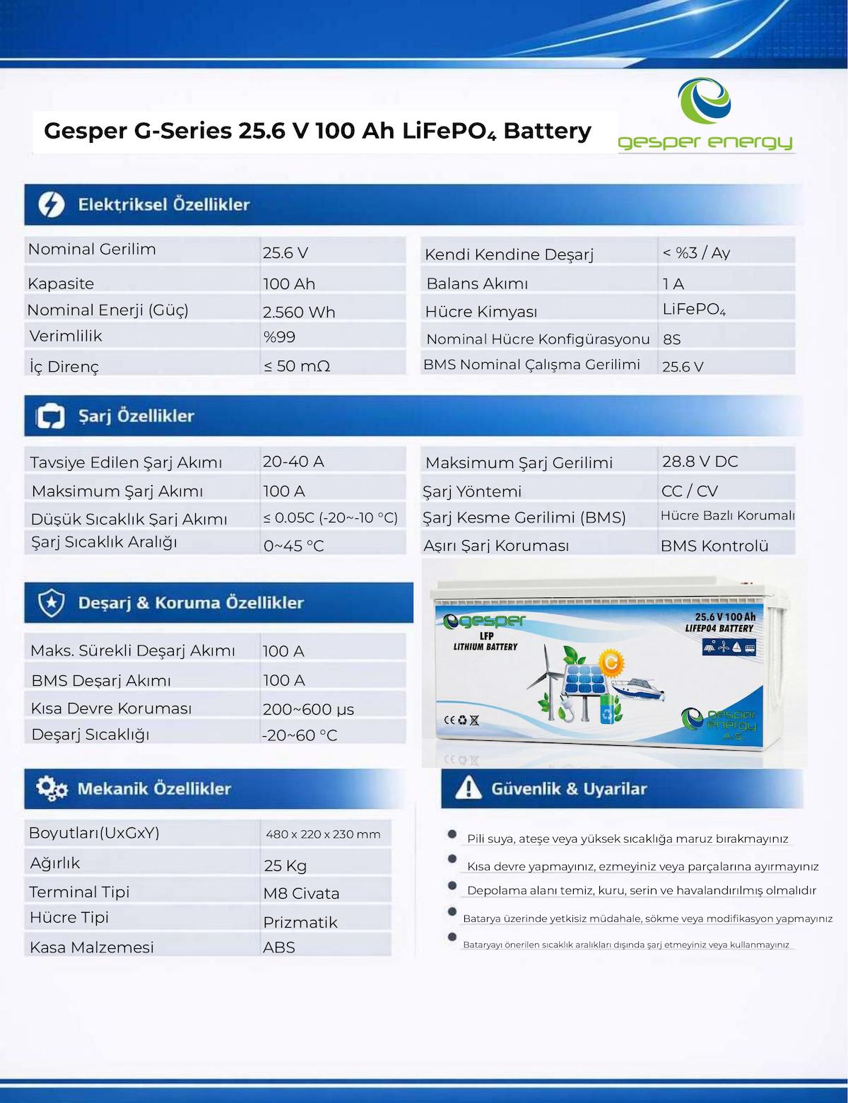 Gesper 25.6 V 100 Ah LiFePO₄ Lityum Akü