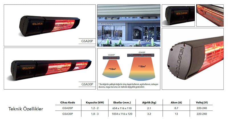 Ayrıca IP55 su ve toz koruma standartlarına göre test edilmiş ve sertifikalandırılmıştır. Bu nedenle ısıtıcılar açık alanlarda gönül rahatlığı ile kullanılabilir.