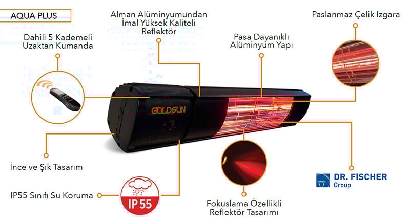 Goldsun Aqua serisi elektrikli ısıtıcılar özel tasarım reflektörleri sayesinde ısıyı yoğun odaklama kabiliyetine sahiptirler.