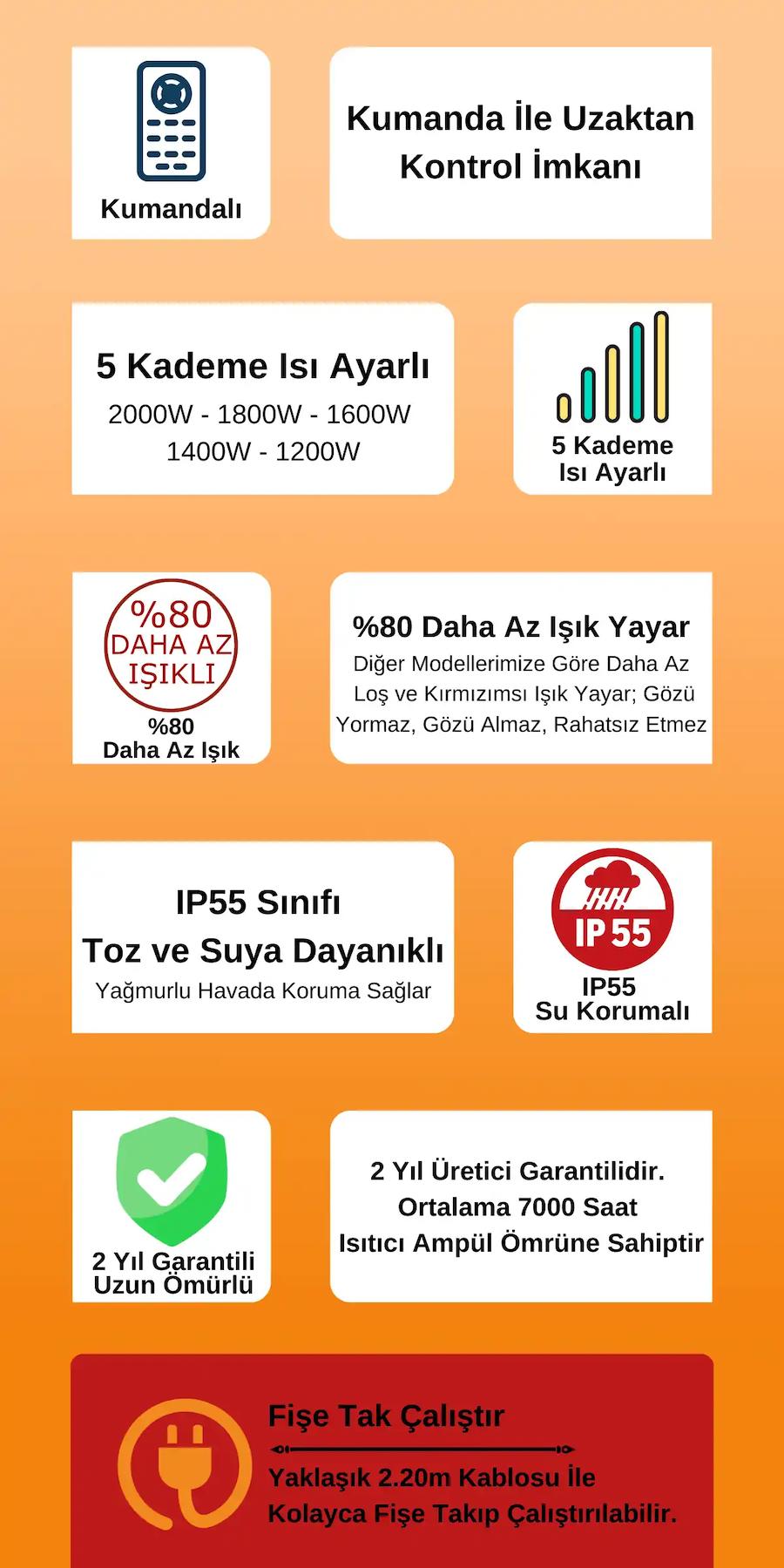 Yağmur kar sizi durdurmasın, Goldsun SUPRA PLUS IP55 derecesindeki su koruması sayesinde hiçbir tehlike içermeden sorunsuzca ısıtır, konforlu bir ortam sunar.