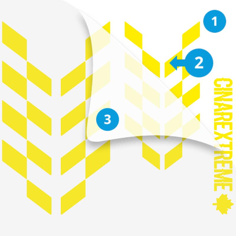 - Jant şeridinin 3 katmanı vardır. 1 zemin, 2 Jant Şeridi, 3 transfer bandı. Transfer bandı ürünü istenilen yüzeye kolayca uygulamak için kullanılır.