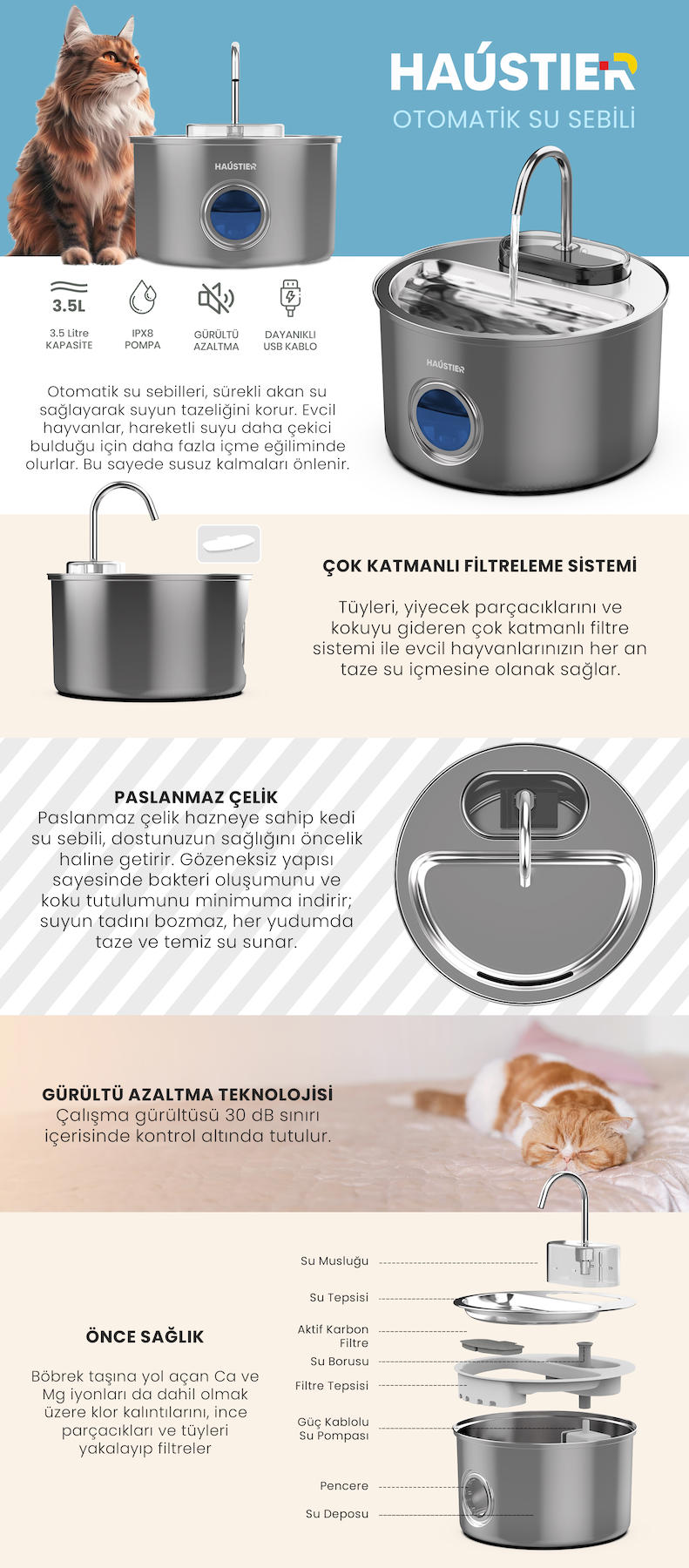 Haustier WF009LS-M Otomatik Kedi Su Pınarı,Kedi Su Sebili, Su Çeşmesi3.5Lt Geniş Hazne, SUS304 Çelik, Ultra Sessiz, Çok Katmanlı Filtrasyon, Pencereli Metal Tasarım HAUSTİER TÜRKİYE GARANTİLİ