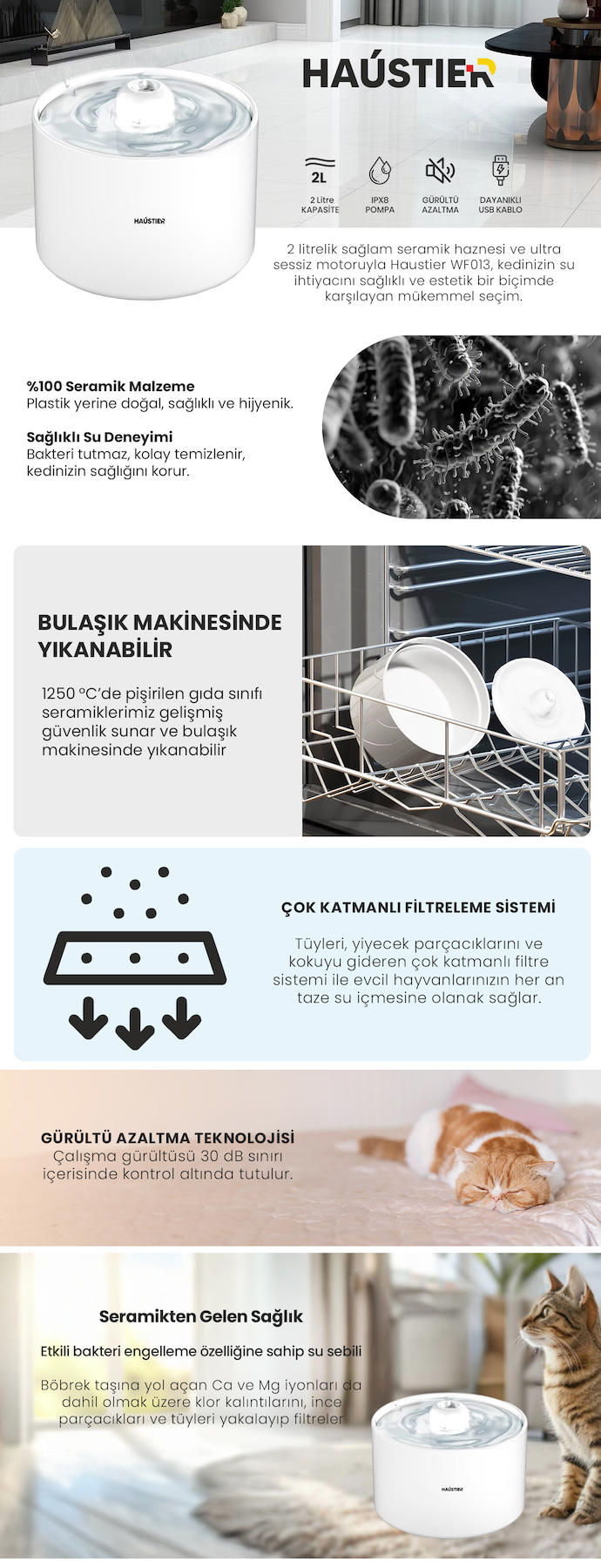 Haustier WF013 Seramik Otomatik Kedi Su Sebili,Su Pınarı, 2Lt Hazne,Çok Katmanlı Filtre,Ultra Sessiz