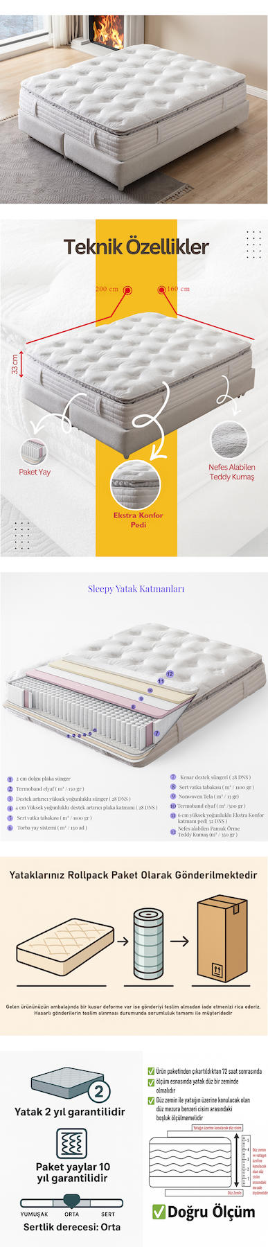 Sleepy Premium Ortopedik Paket Yaylı Yatak 33 cm Pillowtop Teddy Kumaş Tek / Çift Kişilik Yatak