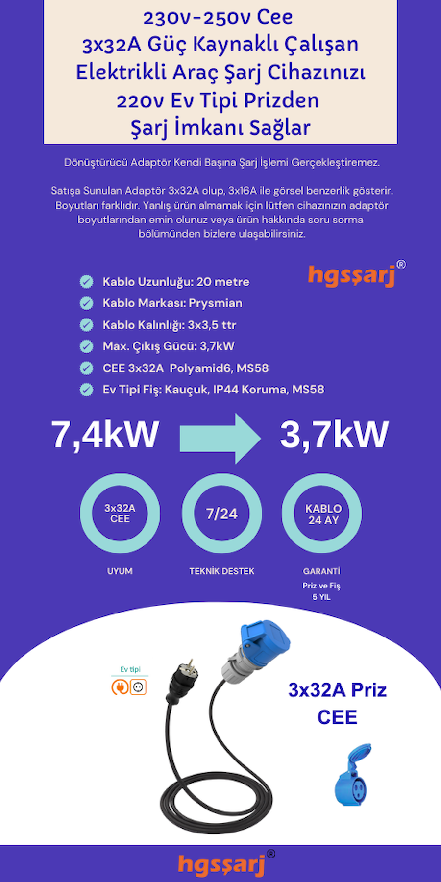 Hgsşarj 20M - 3X32A 220V ile Çalışan Cihazınızı, 220V Ev Tipi Prize Bağlar. Elektrikli Araç Şarj İstasyonu Dönüştürücü Adaptör