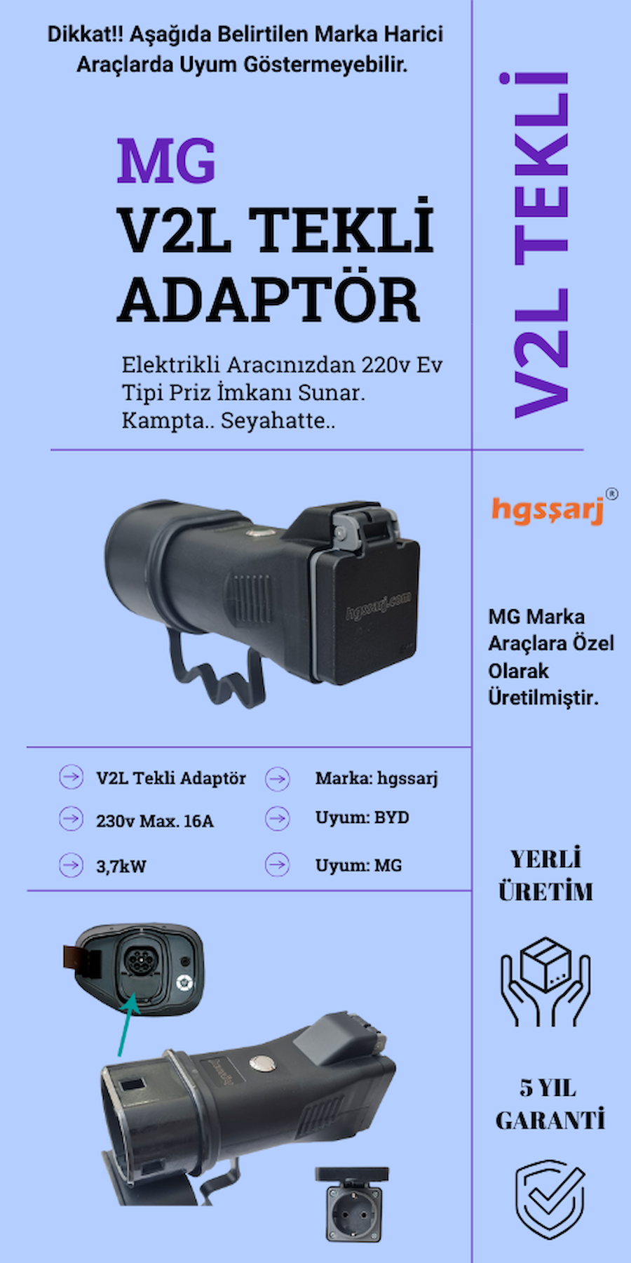 Hgsşarj Mg, V2L Tekli Adaptör, Elektrikli Aracınıza 220V Ev Tipi Priz İmkanı. Kampta - Seyahatte