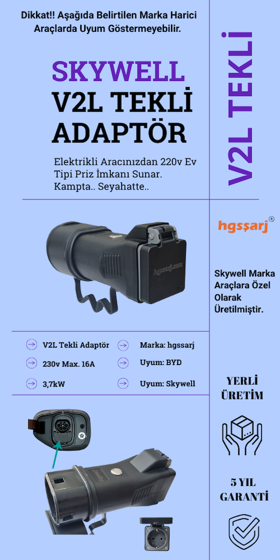 Hgsşarj Skywell, V2L Adaptör Tekli, Elektrikli Aracınıza 220V Ev Tipi Priz İmkanı, Kampta – Seyahatte